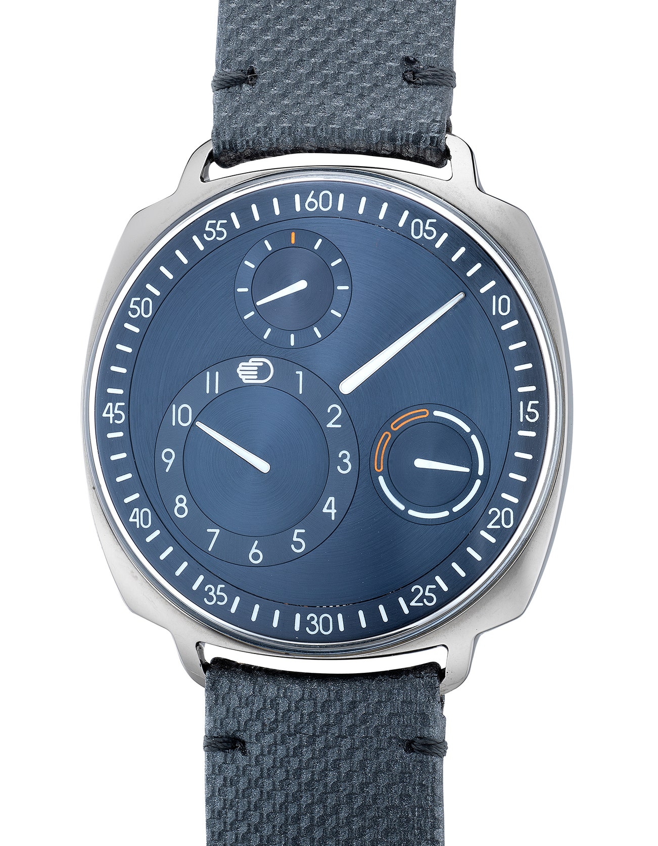 A new winding and setting system is introduced with the Type 1 Squared, featuring a turning key that folds seamlessly into the caseback when not in use. This mechanism is beautifully designed and feels organically natural as it turns simultaneously with the Ressence Orbital Convex System. Steering away from the traditional moving-hand dial, the hours, minutes, seconds and days of the week with AM/PM indication are displayed in four independent subdials, an ingenious configuration that enjoys much recognition among collectors and their peers.