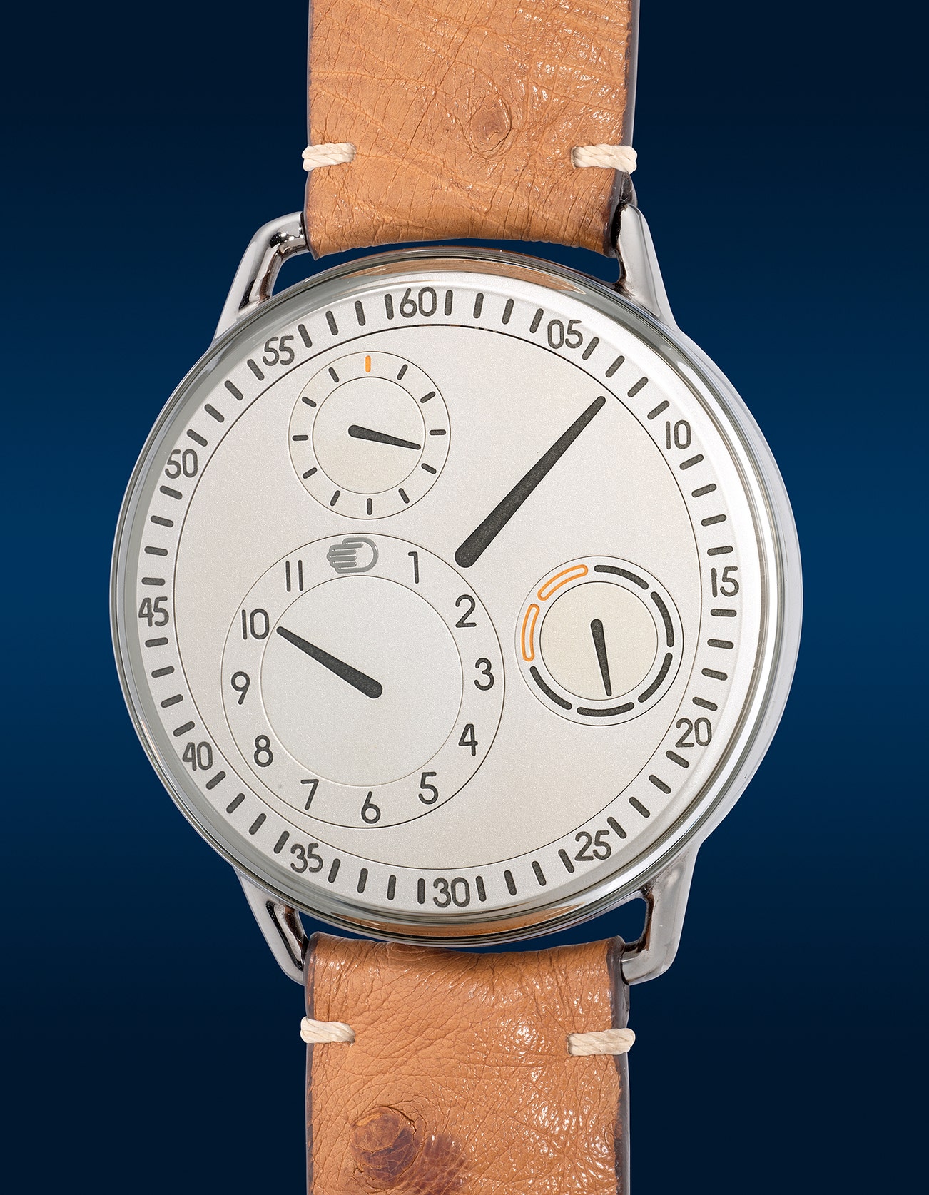 - At first glimpse, the dial appears devoid of moving hands (just a small printed hand indicating 12 o’clock as a cheeky nod to the “beyond hands policy”). This ingenious horological wonder upends conventions through design innovation. The dial rotates via Ressence's patented Orbital Convex System, with four subdials displaying hours, minutes, seconds and day. The day indicator also denotes AM/PM.