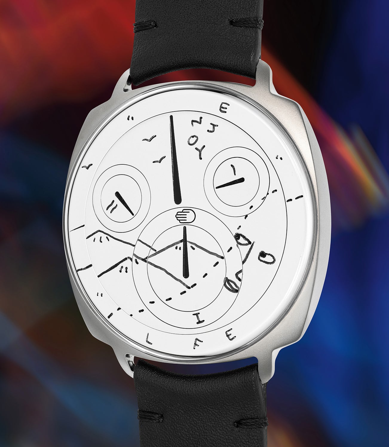 Such a collaboration creates a unique interaction between visual storytelling and mechanical ingenuity. Featuring a white dial and only black hands, carved into Ressence’s signature flush rotating discs, the watch serves as the perfect blank canvas for Martin’s celebrated black-on-white drawings.