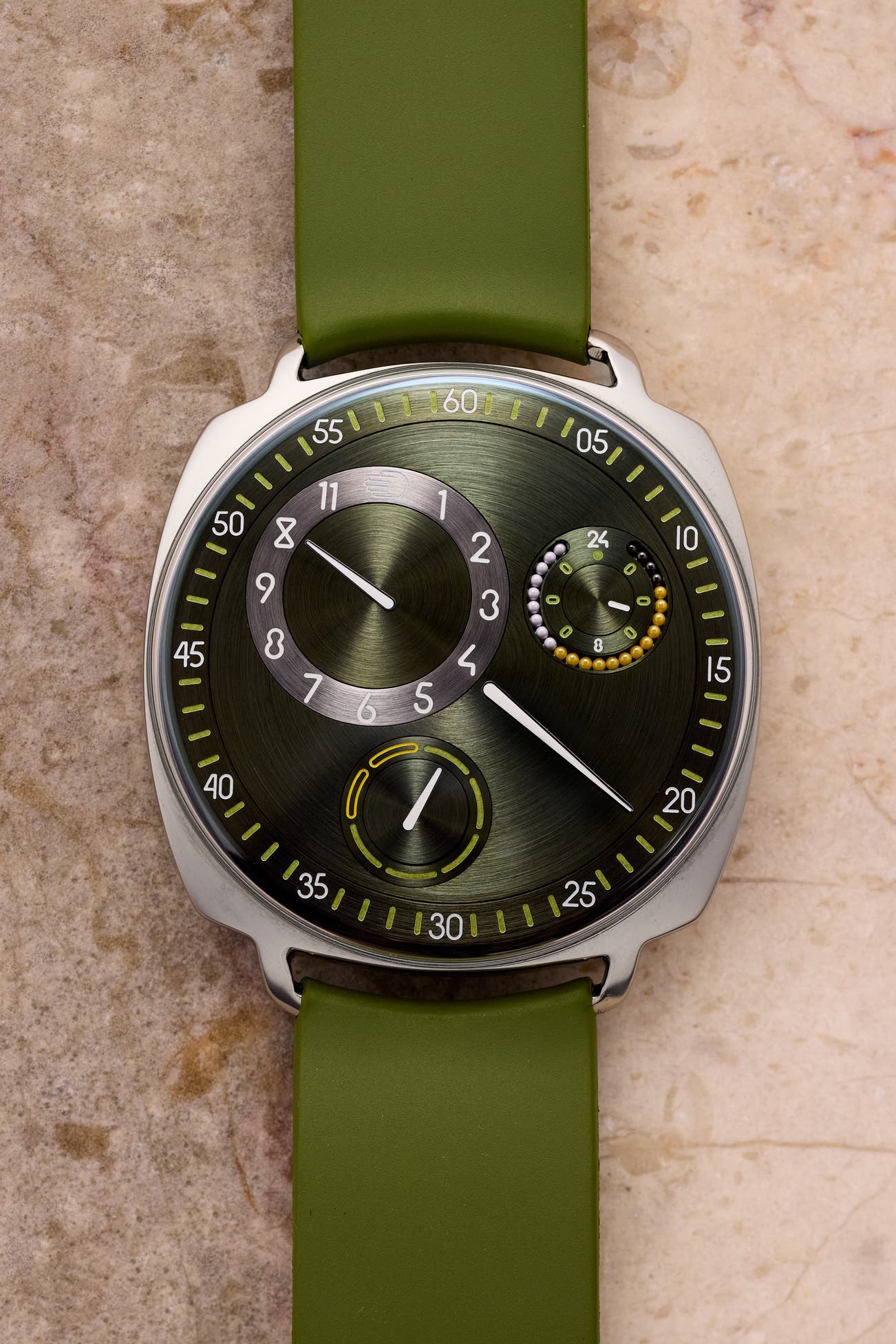 • Based on the Type 1 squared case introduced in 2017, the case is polished grade 5 titanium featuring a concentrically brushed green dial with white arabic numerals on the outer track.