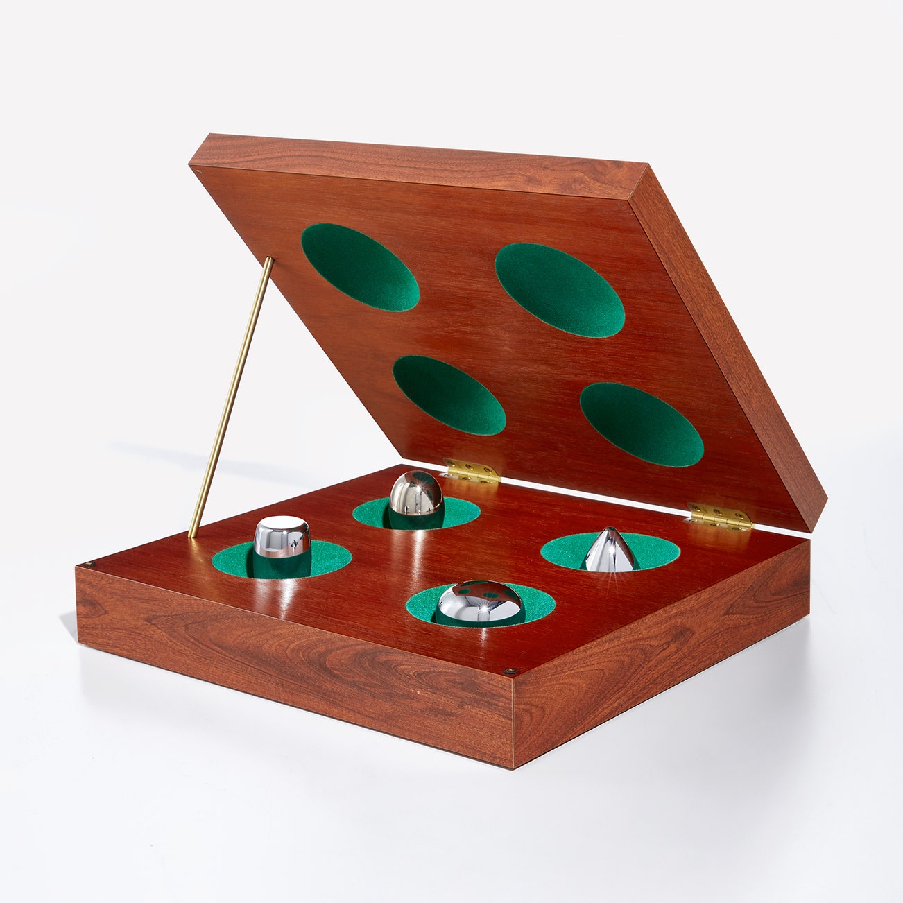 Mahogany, formica and brass box multiple with green flocking and four chrome-plated brass objects.