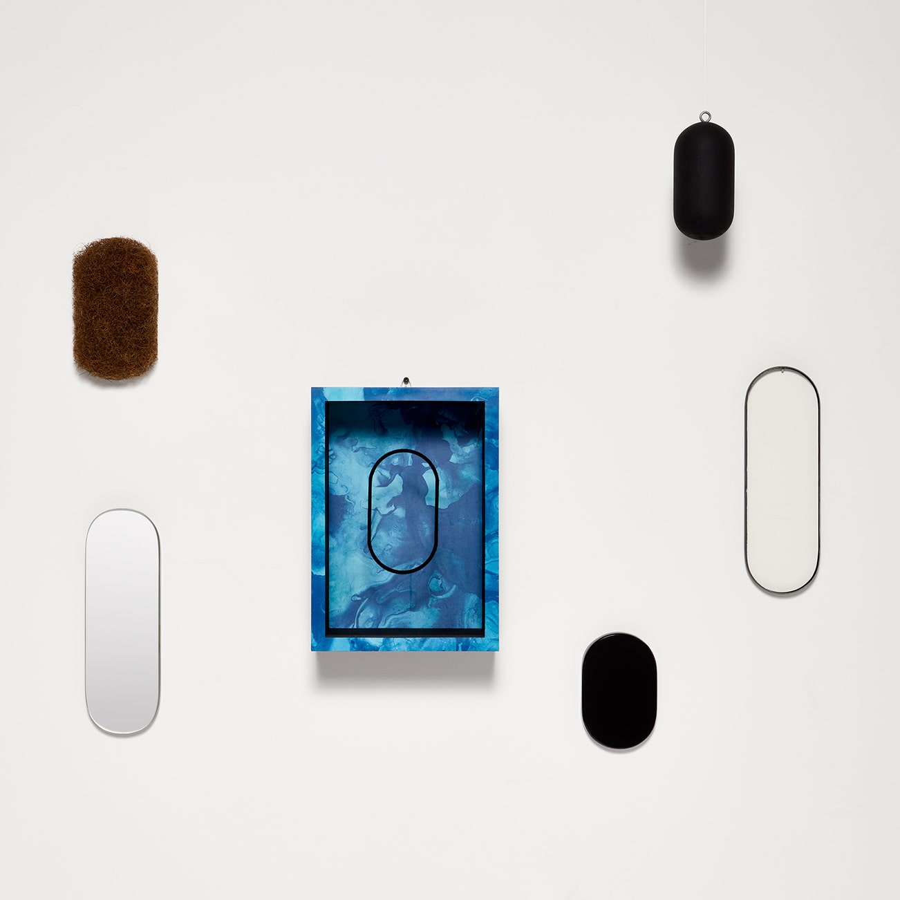 The complete set of five multiples, including wood, glass, Plexiglas, mirror and rubberized horsehair with formica, accompanied by a formica on wood container with Plexiglas lid.
