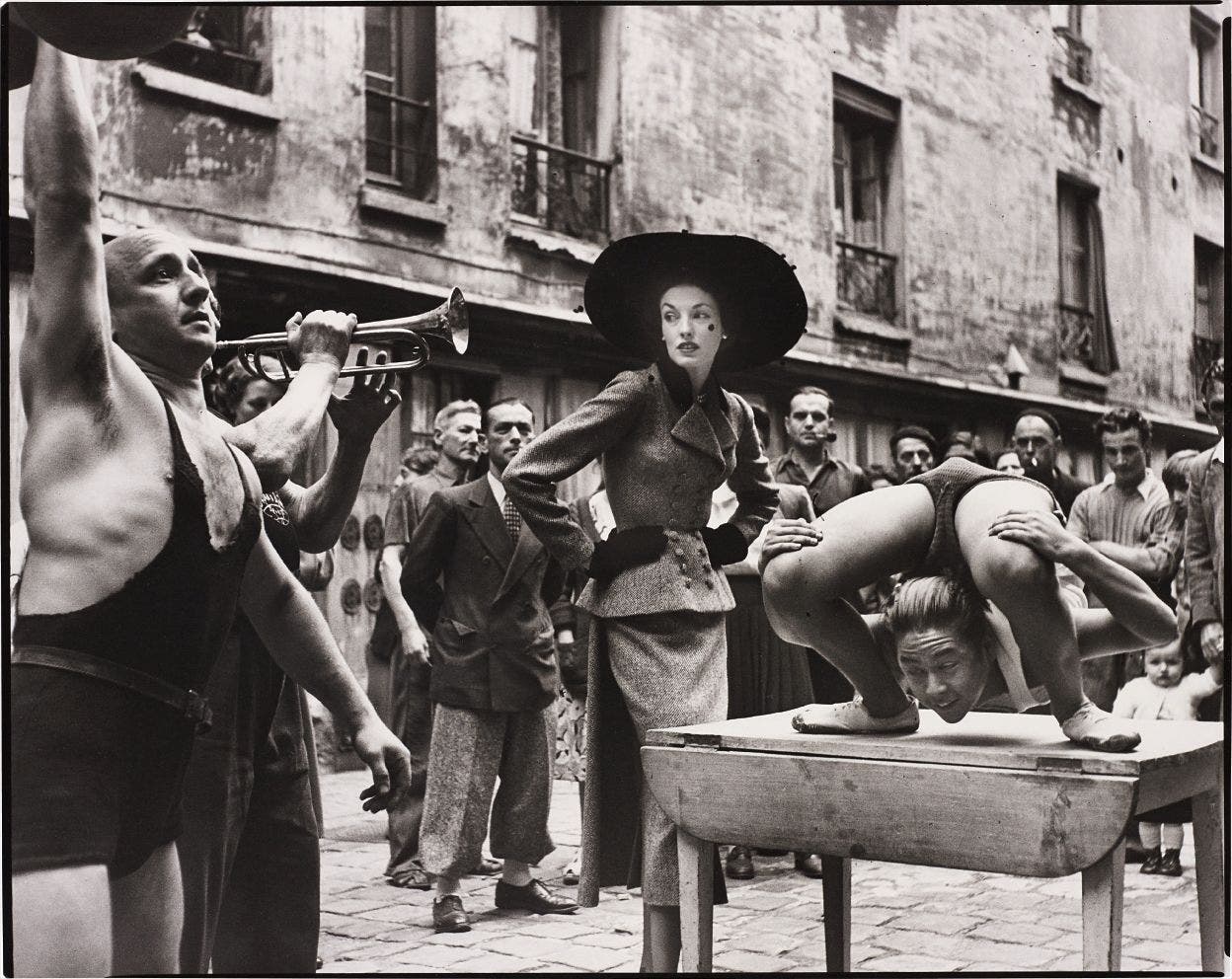 Elise Daniels with street performers, Suit by Balenciaga, Le Marais, Paris, August