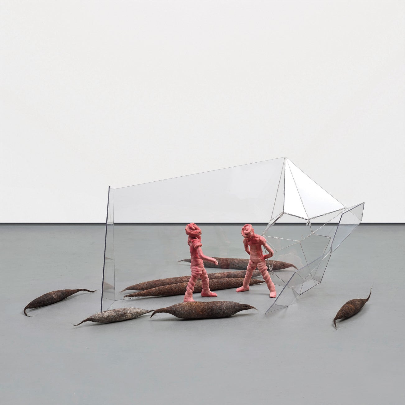 The present work, a collaborative scene from Richard Deacon and Thomas Schütte’s Them and Us exhibition at Lisson Gallery in 1995, transports the viewer into the fantastical and dramatic realm of Deacon and Schütte’s artistic self-reflection. Whilst planning the show, the duo became engaged in extensive discourse concerning 'scale, monuments, man and animal, man and man, man and light, space and colour and so on…' (Thomas Schütte, quoted in Matthias Winzen, ed., Siemens Kulturprogramm, Ostfildern, 1997, p. 111). Twelve mythical scenes emerged from the artists’ imagination with Schütte’s rudimentary and mysterious spirits interacting with Deacon’s animal hair sculptures. Investigating the connection between man and his surroundings, each of Schütte’s seemingly emotionless yet active figurines is left deliberately paired with Deacon’s tactile sculptures. Both figures, each with undeveloped physiognomy and spherical form, reveal themselves as the intricate workings of the artist’s hand. Explicitly forging boundaries through the divisive title Them and Us, the artists bring the perception of the relationship to the fore with the figures always relating 'to their surroundings, to the space, to the viewer, to each other' (Thomas Schütte, quoted in Matthias Winzen, ed., Siemens Kulturprogramm, Ostfildern, 1997, p. 111). Them and Us (X) studies the relationship between individuals and objects whilst simultaneously revealing the workings of Deacon and Schütte’s artistic introspection.
