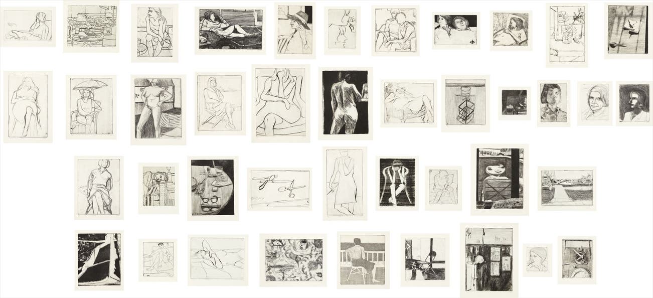 #1 (the artist's wife, Phyllis); #2 (the artist's living room in Berkeley); #3 (seated woman with part of a table near her right leg); #4 (Phyllis); #5 (Phyllis wearing a hat); #6 (two portraits of Phyllis); #7 (Phyllis and her friend, Flora); #8 (double portrait of Phyllis with motif taken from a rug in the artist's living room and used as the insignia for the cover of the book); #9 (the artist drew on the plate during a model session with several artist friends); #10 (similar to the unique impression, Composition With Leafy Plant in Vase With Fork and drawn at the same time); #11 (opened letter on a table); #12 (Phyllis on outside deck); #13 (artist's daughter, Gretchen); #14 (Phyllis on the patio, 6-16-65 in drypoint on the plate); #15 (standing nude with arms on hips); #16 (the artist drew on the plate during a model session with several artist friends); #17 (back view of standing nude woman with partial reflection); #18 (Phyllis in striped chair); #19 (still life with pencil, glass and box with cigarettes); #20 (painting in artist's studio lying on its side behind a small table); #21 (portrait of Phyllis); #22 (portrait of Phyllis); #23 (portrait of Phyllis); #24 (Phyllis seated in rattan chair); #25 (Phyllis leaning head on arm of couch); #26 (table still life with ashtray and numbers); #27 (still life with silverware, scissors and three crosses); #28 (sketch of Kathan Brown done at Crown Point studio); #29 (woman seated in curved-back chair resting elbows on knees); #30 (Phyllis at home); #31 (looking out at deck of Diebenkorn residence); #32 (streetscene -trees, houses, lawns); #33 (hillside streets); #34 (nude drawn during model session); #35 (reclining nude woman with arm over her head); #36 (table setting with flowery tablecloth); #37 (crosshatched drawing of woman in chair, turning her back); #38 (chair, potted plant, woman standing); #39 (interior of artist's studio on Adeline Street in Berkeley); #40 (Phyllis); and #41 (still life with plate and open scissors)