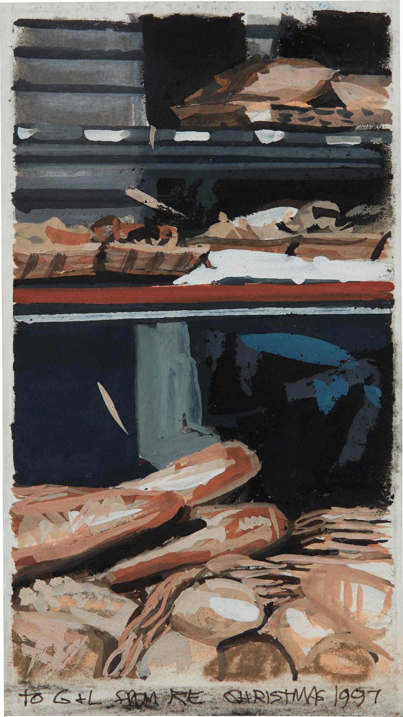 signed with the artist's initials, dedicated and dated "to G+L FROM RE CHRISTMAS 1997" lower edge