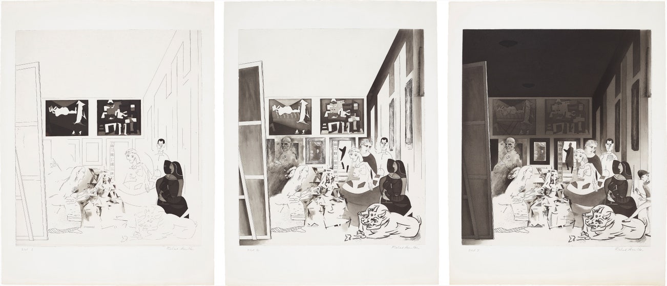 Picasso and Hamilton are not alone in regarding Las Meniñas [by Velázquez] as one of the most important works in Western art: Picasso had displayed his admiration for the painting by making forty-five pastiches between August and December 1957. In his carefully wrought etching Hamilton is perhaps more reverential: 'The stage of Velázquez' "meninas" could carry a lot of action, and the mysterious ambiguities (it seems to contain an infinity of cross reflections within the space the picture confronts), allowed some narrative interplay with substitutions of personalities as well as styles...Hamilton adopts a different period of Picasso's work for each of the characters in Velázquez' masterpiece in such a way that the many styles of Picasso are (as his title suggests) hand maidens to the artist rather than the Infanta. Hamilton developed the pictorial idea in three studies made in 1973, which he then used to create the plate in Paris. Six different stage proofs document the progress of his work in the Atelier Crommelynck. Etienne Lullin Richard Hamilton, Prints and Multiples 1939-2002, p. 124