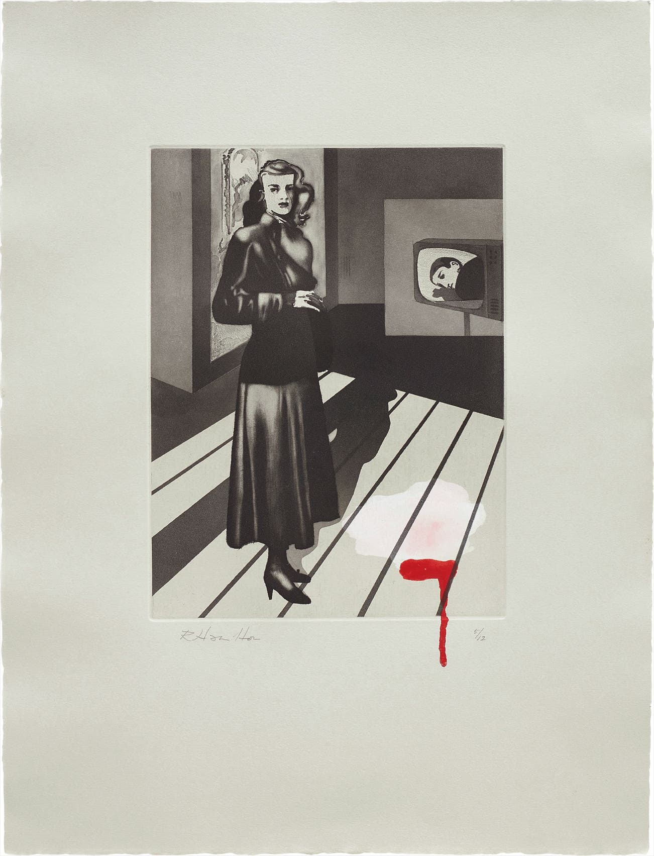 Soft-ground, lift-ground and step-bite aquatint, scraper and burnisher with unique hand-colouring in acrylic and enamel paint, on grey Rives paper, with full margins.