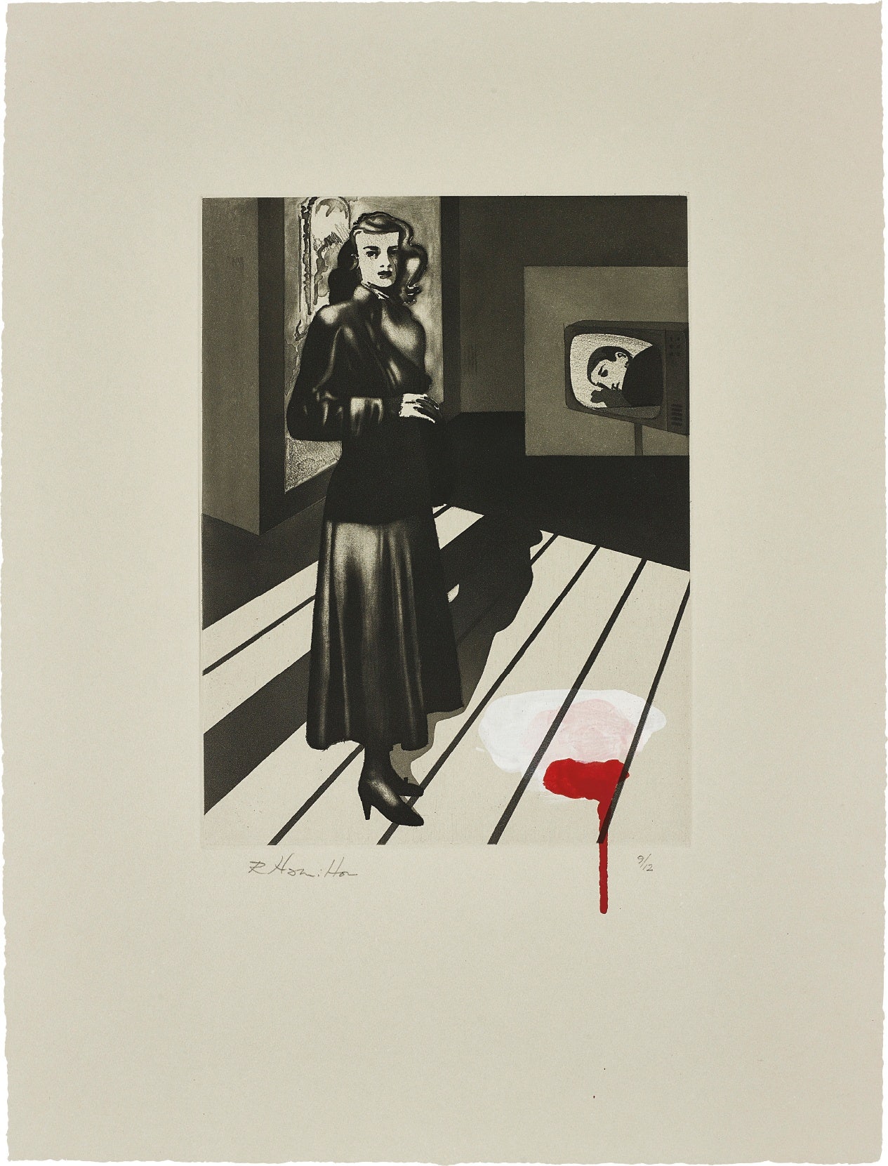 Soft-ground, lift-ground and step-bite aquatint, scraper and burnisher with unique hand-colouring in acrylic and enamel paint, on grey Rives paper, with full margins.