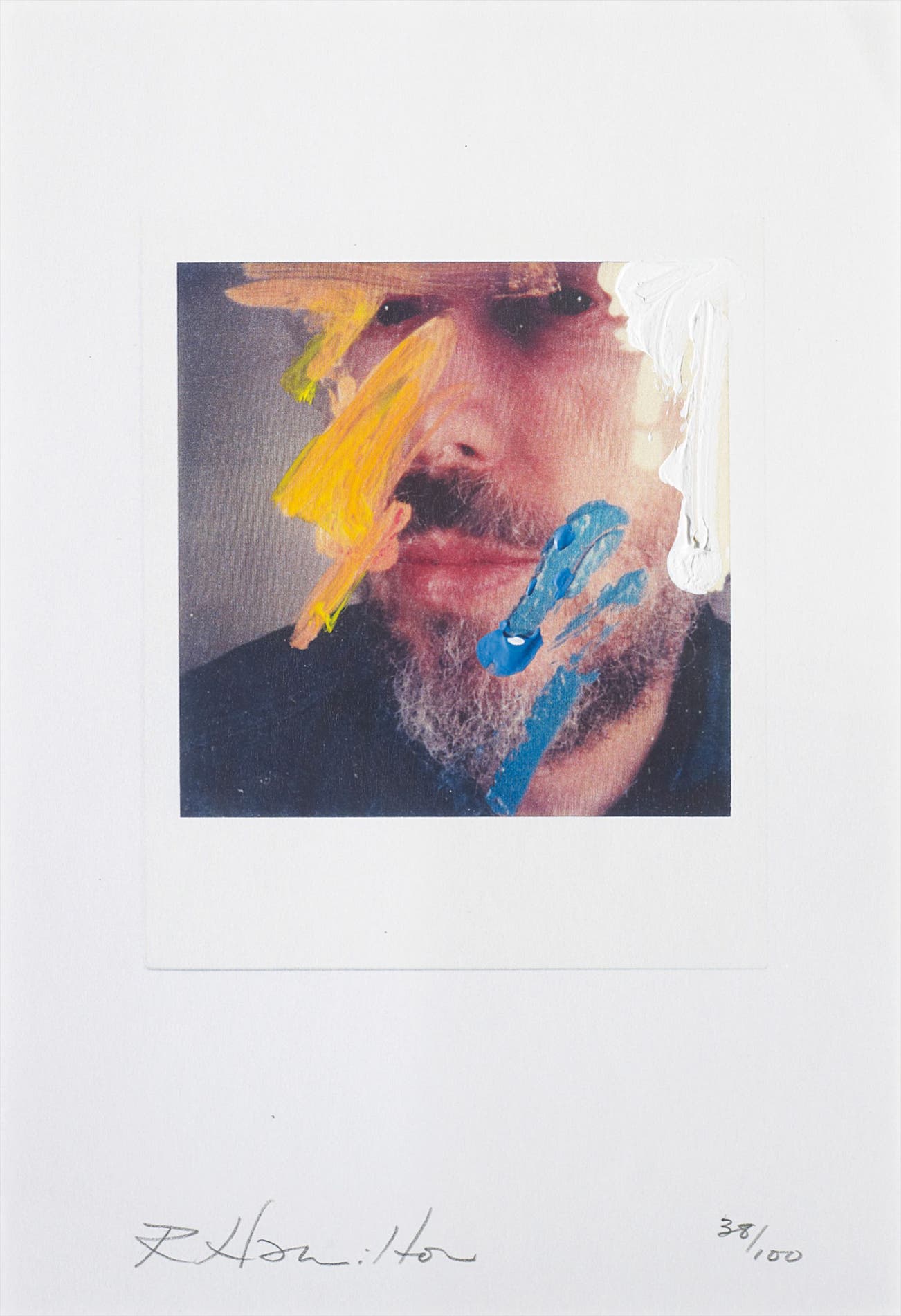 Colour copy of a polaroid self portrait, with hand-colouring in blue, white and yellow acrylic paint, on wove paper, with full margins,