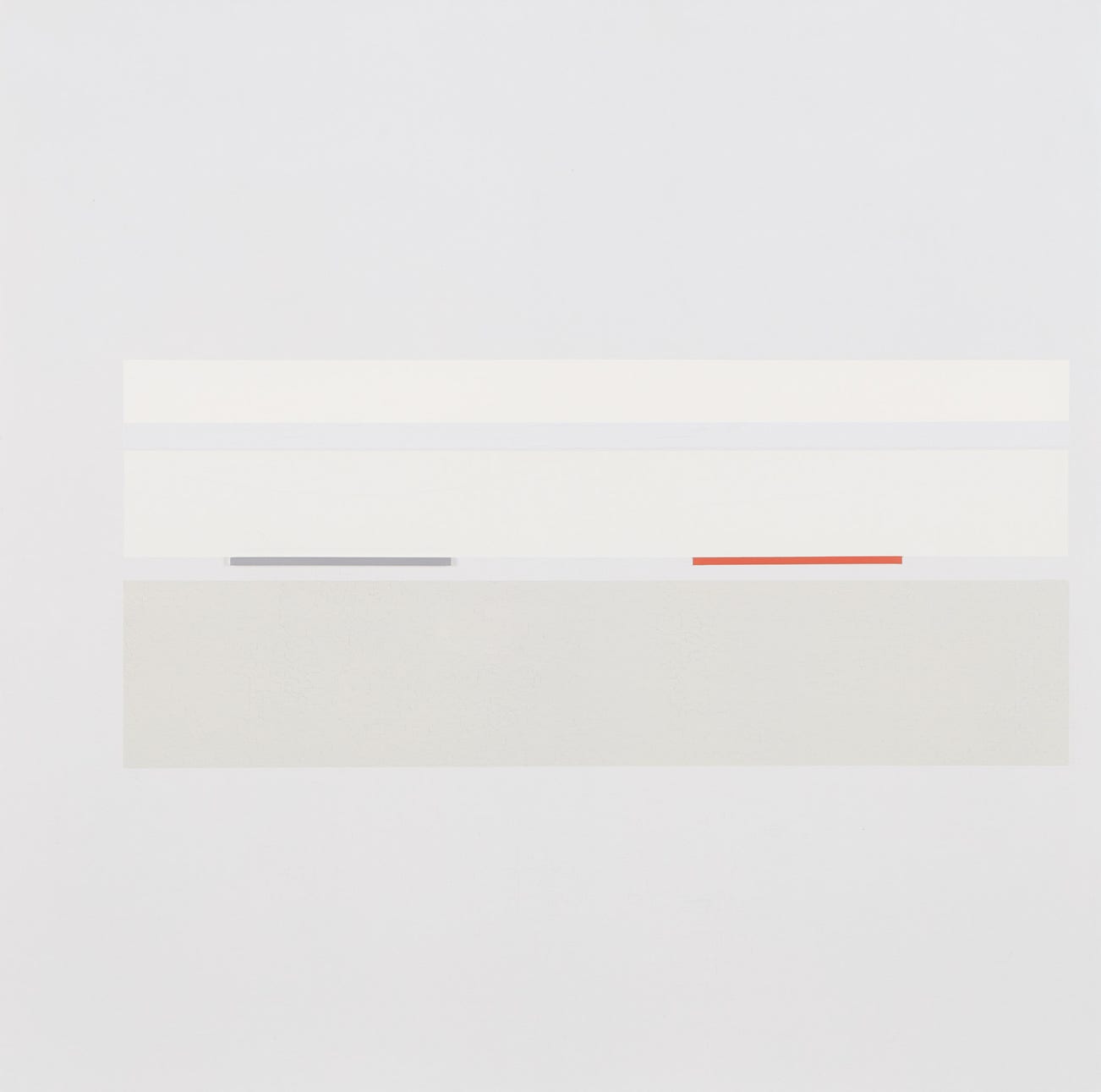Lin began creating art in the late fifties from the ideals of an Abstract Expressionist. In 1958, he began layering blocks of black and white on canvas to compare and contrast darkness and light. In the sixties, he simplified the elements of his creation; he made use of more precise lines and gradually abstained from color until white was all that remained. This period marks the establishment of Lin’s artistic style and the birth of his most iconic series — the White Series. He continued to develop this series until he declared in 1984 that ‘painting is dead,’ then turned his focus to three dimensional arts. When observing Lin’s work, one sees undeniable elements of Minimalism. His work departs from representational forms, using only lines and squares to create a precise and rational composition; and his execution is so meticulous and careful that brushstrokes are undetectable. However, Lin’s work is readily distinguishable from other minimalist works. One distinctive characteristic of Lin’s art is his multitudinous use of whites — rich or diluted, heavy or light — which he applies in lines of varying length and width. He then pairs aluminum plates and the occasional, yet ingenious, strokes of red, yellow, gray, and black. Lin does not necessarily abide by the standards of Minimalism — he is not regulated by the purely logical use of geometrical shapes, nor is he insistent upon removing all emotion or denouncing lyricism. In Lin’s paintings, we see a greater energy; we feel presence within absence, and we perceive a fluid sensibility that flows beneath the surface of the rational composition.