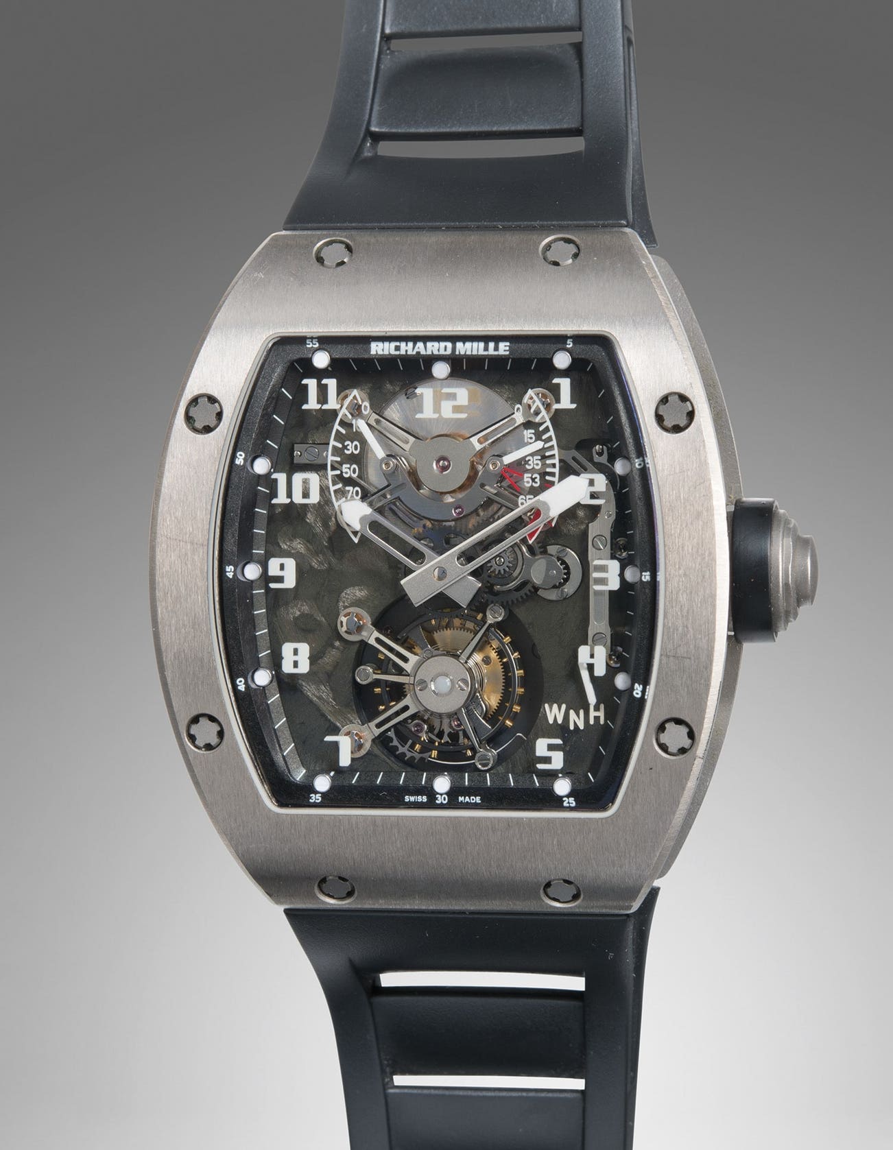 Released in 2002, the RM002 manually-wound tourbillon is a feat of engineering and technology and makes a closer connection to automotive racing with the inclusion of a gear like function selector. Prominently displayed between the 4 and 5 positions, the function selector is changed through a button in the crown, similar to the gearbox, the watch can be set to H (Hands) for time selection, N (Neutral) normal running time and W (Winding) for winding. The torque indicator runs between 0 and 65 with red indicator, a reading below 53dNmm indicates the mainspring is too slack and over 65dNmm indicting excessive tension on the mainspring. The RM002-V2 was the second evolution of the model. It incorporated a movement baseplate made of a composite carbon nanofiber with grey PVD coating, enabling greater structural rigidity for improved shock resistance. Visible through the sapphire crystal dial, the carbon nanofiber baseplate is not only functional, but also visually appealing.