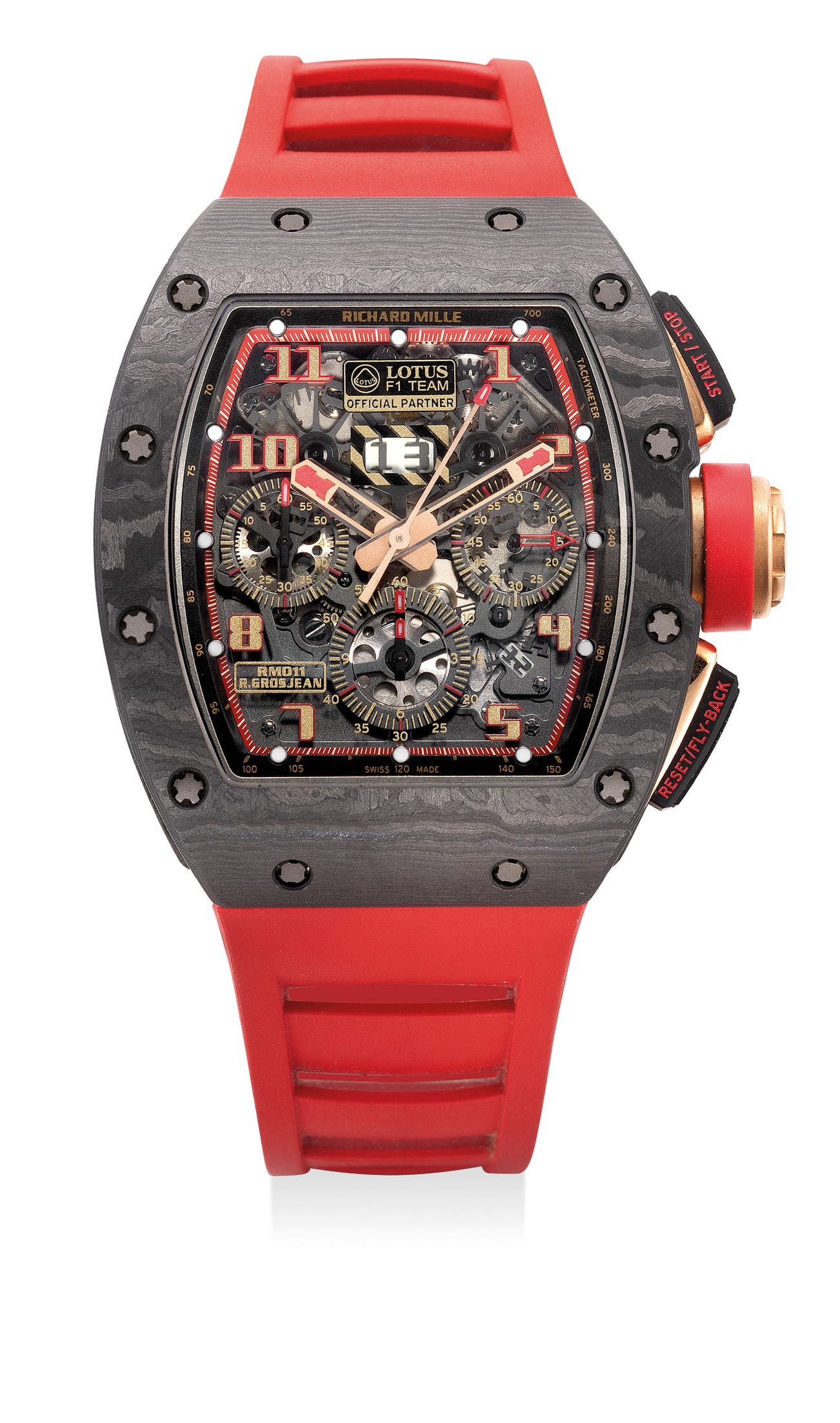 The present example is a highly attractive Richard Mille RM-11 R. Grosjean for the Lotus F1 Team. Introduced in 2014, acclaimed F1 driver Romain Grosjean was introduced to the list of elite athlete ambassador for the brand. Featuring colors of the British racing team and the advanced NTPT carbon, the RM11 is presented with a new appeal with aesthetical enhancement. The present example is presented in excellent overall condition and is complete with the full set of accessories that came with the watch when it was purchased by the original owner from the Richard Mille Boutique in Hong Kong.