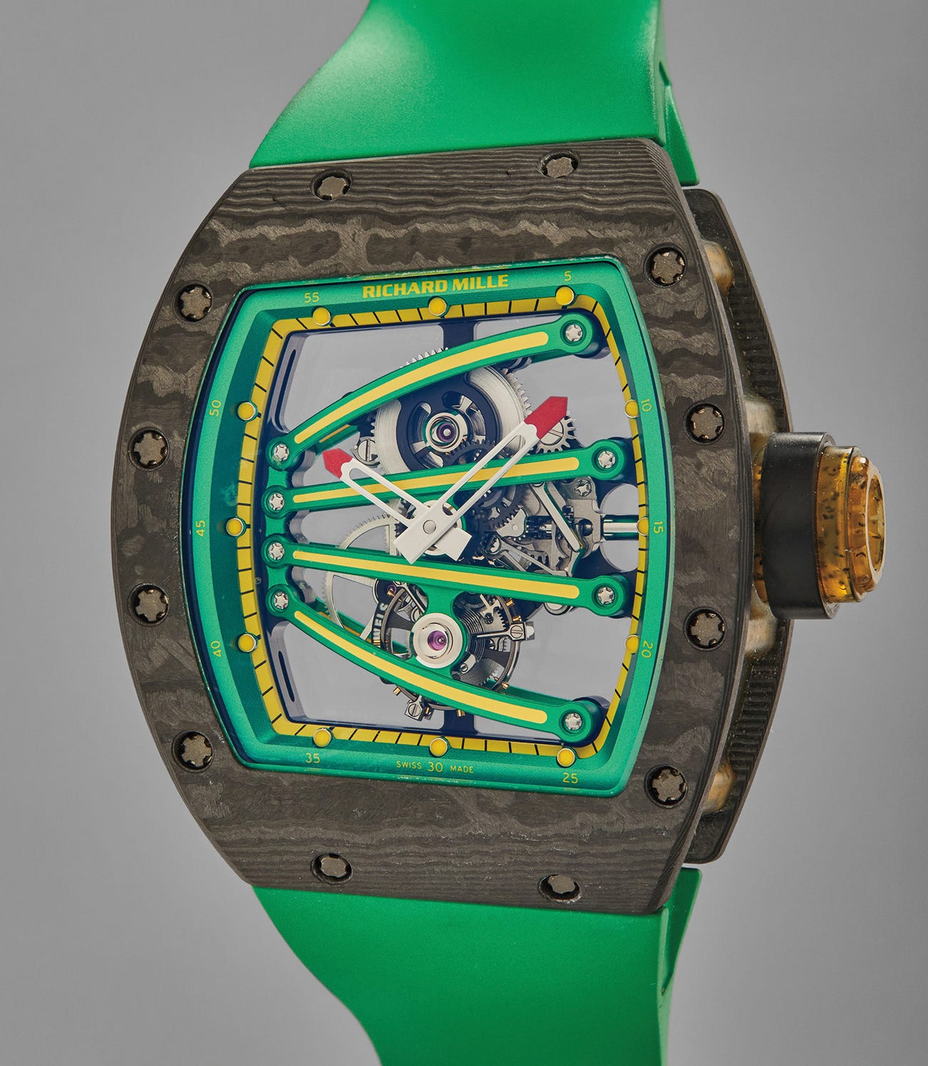 The RM 59-01 impresses immediately, and is one of the most iconic watches ever made by Richard Mille. The watch is lightweight and was designed for Yohan Blake, the second fastest man in history and one of the leading athletes of our time. The bridges spanning the movement are designed to evoke the claws of 'The Beast', Yohan Blake's nickname, and embodies the colours of his Jamaican homeland. The dynamic bridges are made from anticorodal aluminum and support the tourbillon cage, consolidating the grade 5 titanium baseplate. As with all Mille timepieces, the RM59-01 is designed to be worn under extreme circumstances, in this case 100m competitive sprinting.