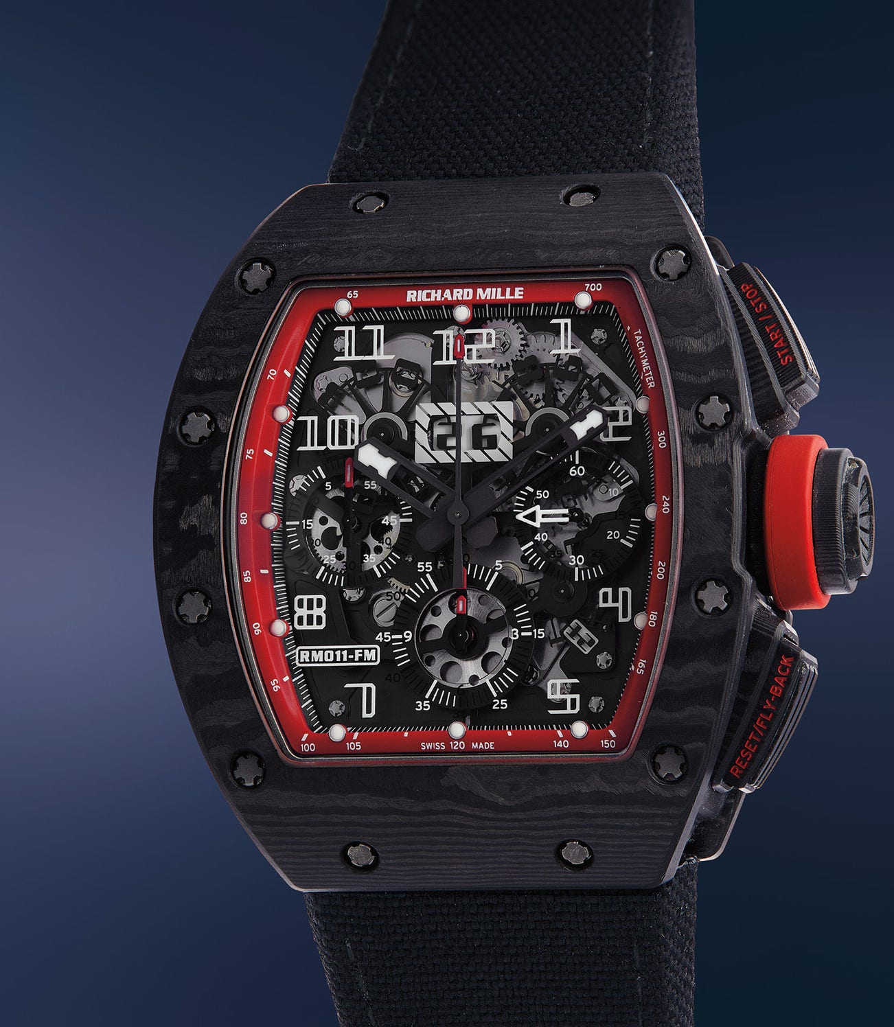 The RM011 was first introduced in 2007, and was the firm’s first chronograph model with annual calendar featuring an oversized digital date display on a skeletonized dial. Since its initial launch, the reference has developed a cult following and an iconic status as one of the brands most important and sought-after models. Traditionally encased in titanium, the present limited-edition model from 2015 continued the relationship between Mille and Massa, and is made with a carbon NTPT (North Thin Ply Technology) case - a lightweight material capable of withstanding the extreme forces of Formula 1 racing.