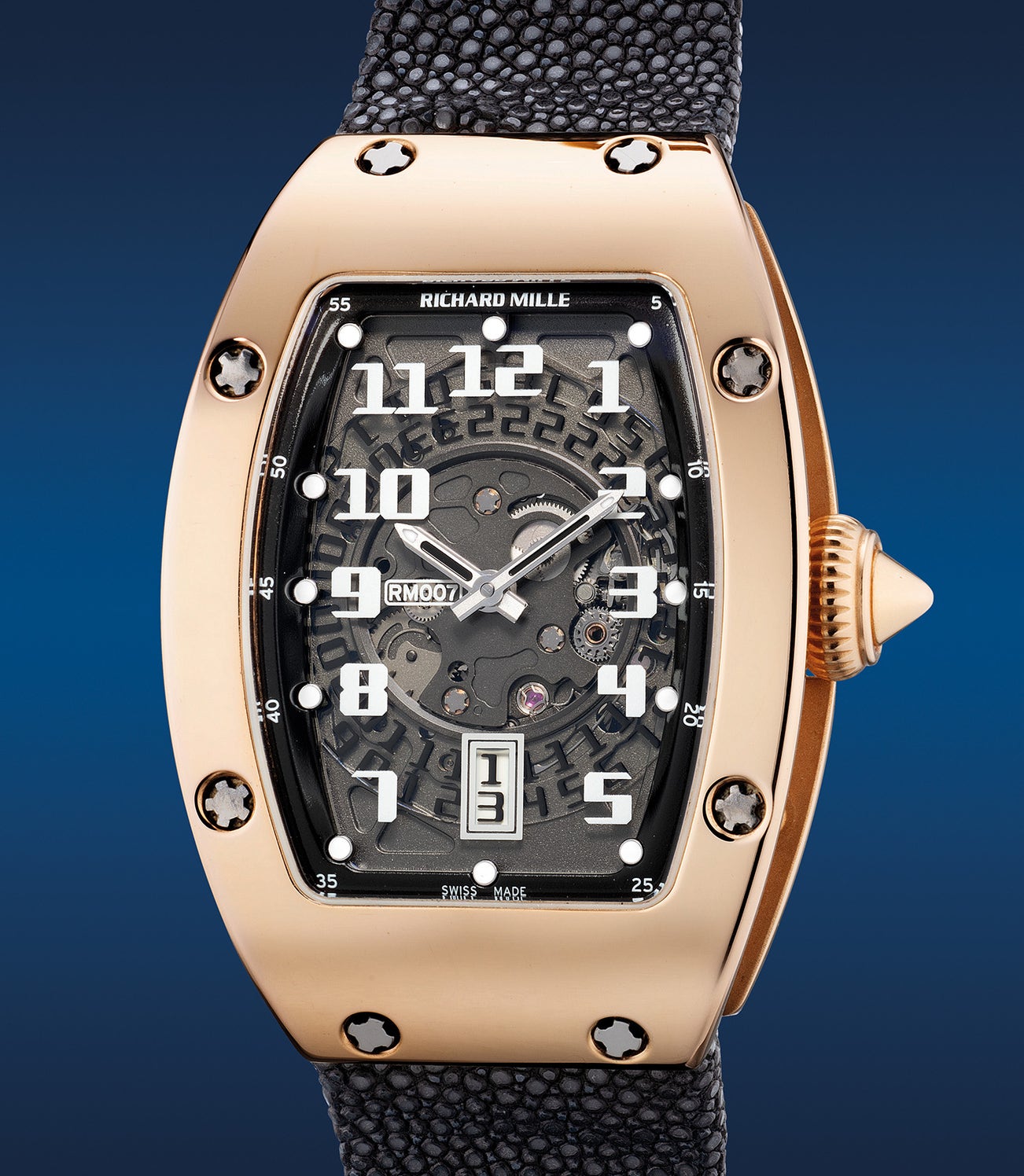 The present RM007 from 2009 shining in a glamourous mirror-polished pink gold face is balanced with eight Grade-5 titanium spline screws, the gorgeous skeletonised dial is finished with a PVD-coating and illustrates incredible depth to this elegant timepiece. Fitted with a transparent sapphire disc with numerals painted in black that rotates through the aperture at 6 o’clock with a contrasting white background, the date of the month stands out from the dial with clear legibility. Furthermore the pink gold case is contrasted with satin-brushed caseband and features a matching gold stud-shaped crown that adds a touch of edginess to the overall chic design.