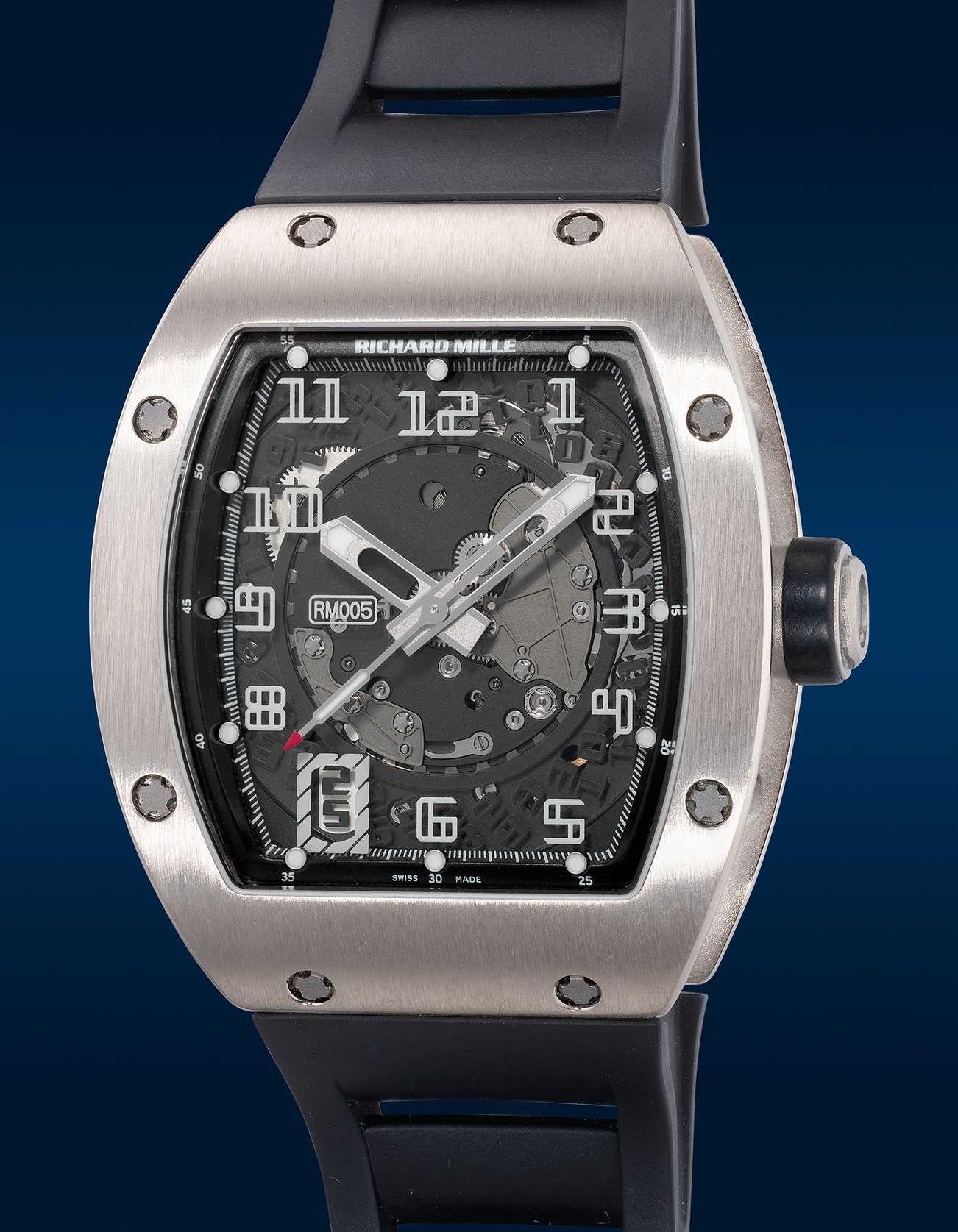 - The RM005 is also marked by the charming date window at the 7 o’clock displaying semi-instantaneous date-change and the inaugural variable-geometry rotor visible via the transparent case back, an invention that allows the movement’s winding mechanism to be optimized and personalized to the owner’s lifestyle by adjusting the six-position rib placement setting. This patented mechanism modifies the rotor’s inertia, either speeding up the winding process in the case of minimal arm and hand movements or slowing it down when high activity sports are pursued.