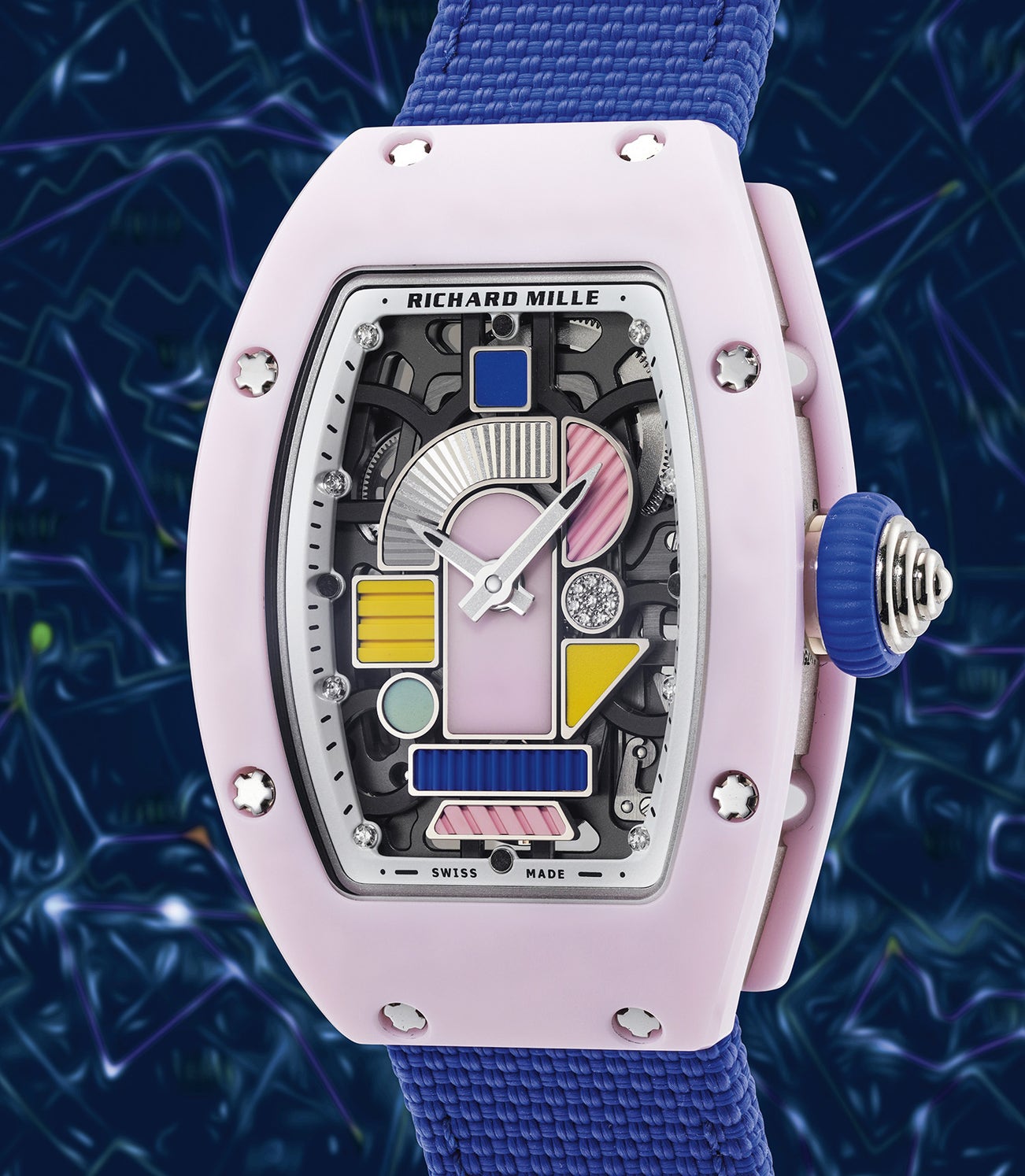 The three models feature a biocompatible ceramic case made of Tetragonal Zirconia Polycrystal (TZP). This material is known for not only its lightness and strength but also its color retention. Other properties include corrosion resistance and toughness superior to sapphire. A special finishing process also gives a matte finish to the case. Preserved in virtually brand new condition, the present version is the blush pink model, which also features diamonds on the dial, as well as ceramic asymmetrical shapes with a guilloché finish.