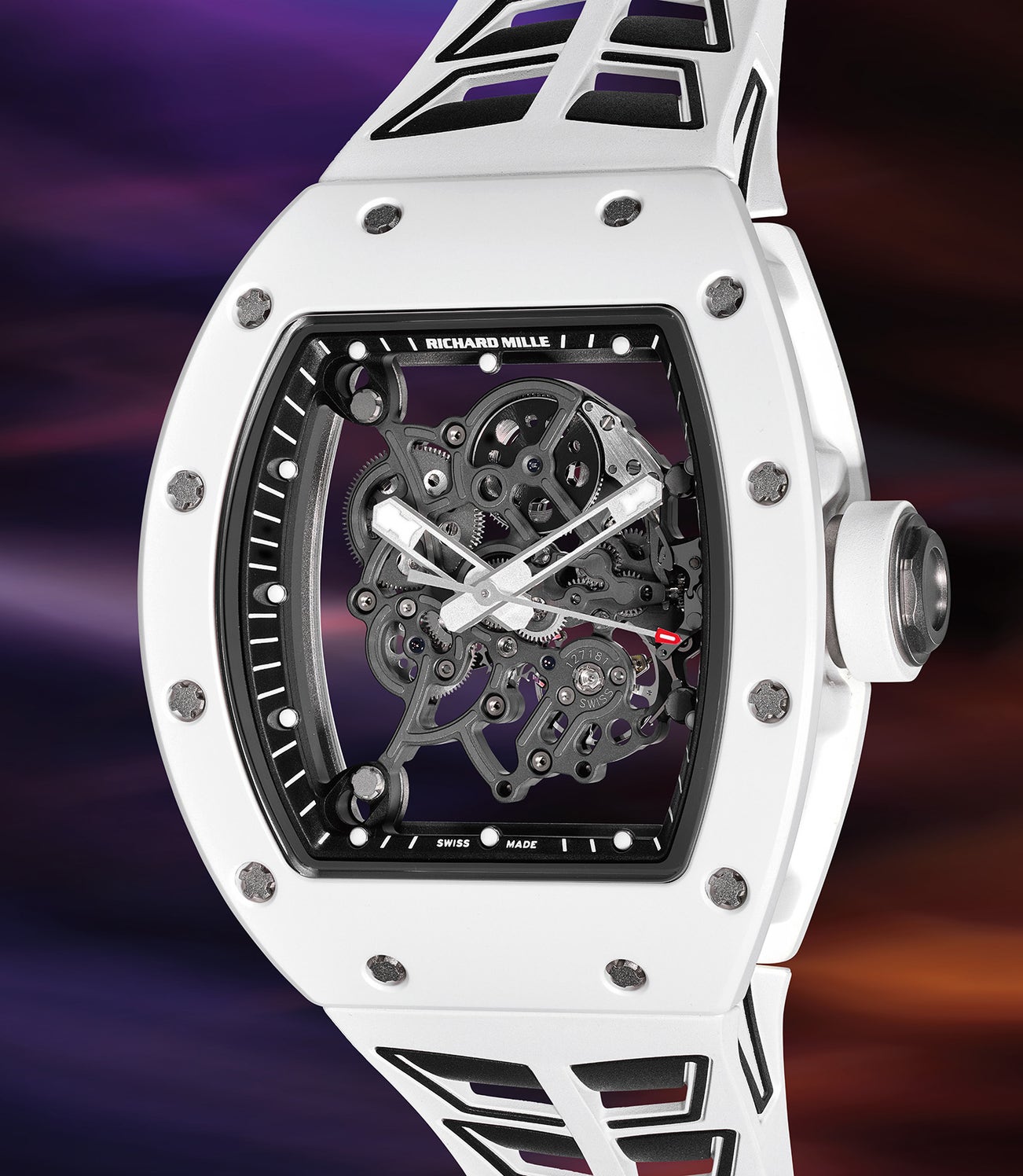 Cased in white ceramic with a rubber-coated grade 5 titanium caseband within the firm’s most iconic tonneau-shape, it displays a fully skeletonized dial showcasing the firm’s innovative cal. RMUL2. Extremely well-executed, the movement weighs an impressively light 4.3 grams. It is cleverly secured by four shock absorbers that create a link between the external framework and the movement itself, therefore protecting the movement against all vibrations.