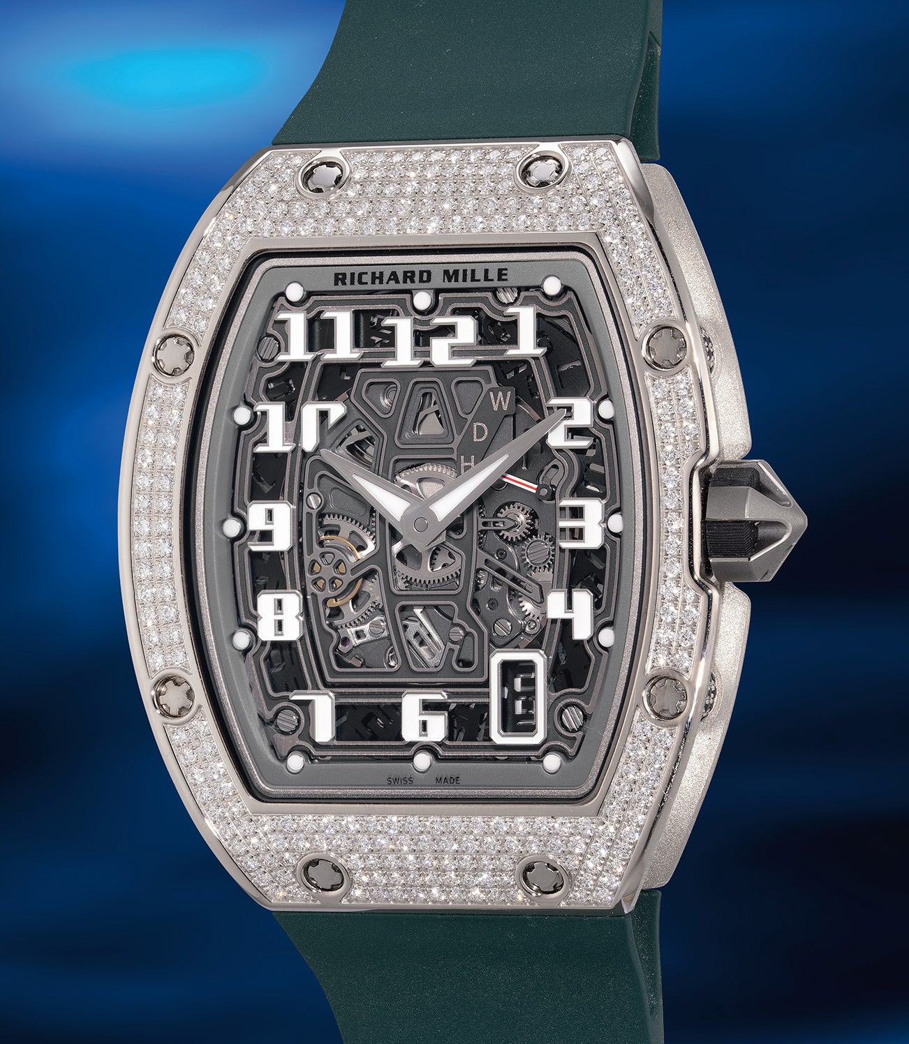 Launched in 2016, the RM67-01 marked the brand’s first slim tonneau-shaped wristwatch, distinguishing itself from its traditionally bulkier counterparts. Available in titanium, white gold, pink gold, and gem-set variations, this reference has quickly become one of the most sought-after models in the Richard Mille lineup. The skeletonized dial exemplifies Richard Mille’s design philosophy, featuring signature Arabic numerals and a digital date display at the 5 o’clock position. The present example is a rare configuration with a white gold case adorned with diamonds, complemented by a diamond-set caseband and clasp for an added touch of elegance and luxury.