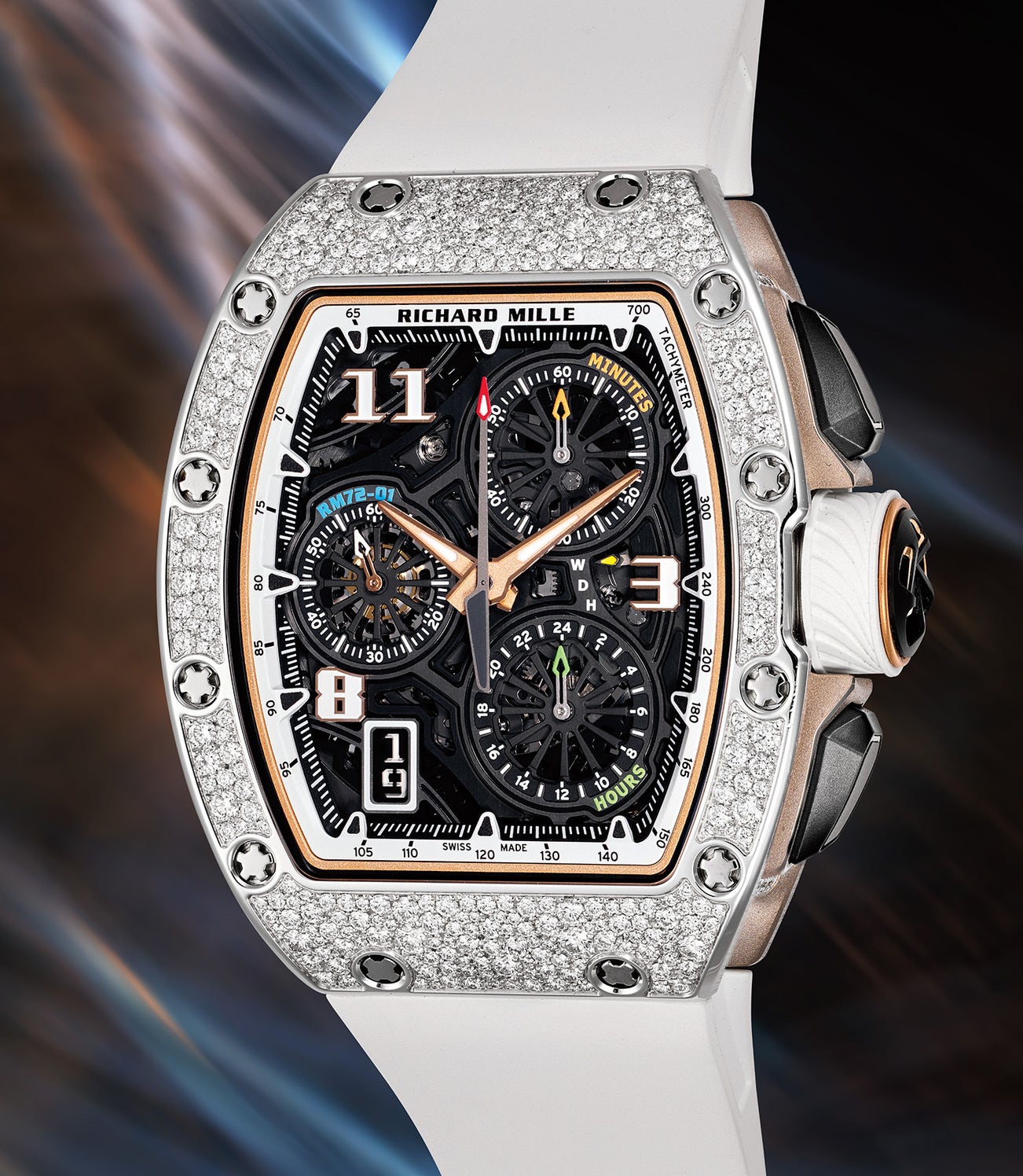 Highly legible, with spots of vibrant color, the dial is undoubtedly inspired by the dashboard of automotive vehicles. Initially available in titanium or pink gold, the present example features a white gold case skillfully paved with diamonds utilizing the “snow setting” process. Diamonds of varying sizes are hand-placed by artisans in close proximity, giving the effect of sparkling light reflecting against fresh snow. It is an increasingly popular form of diamond setting for wristwatches, amplifying the “bling” factor, and is utilized by leading high-end brands including Patek Philippe.