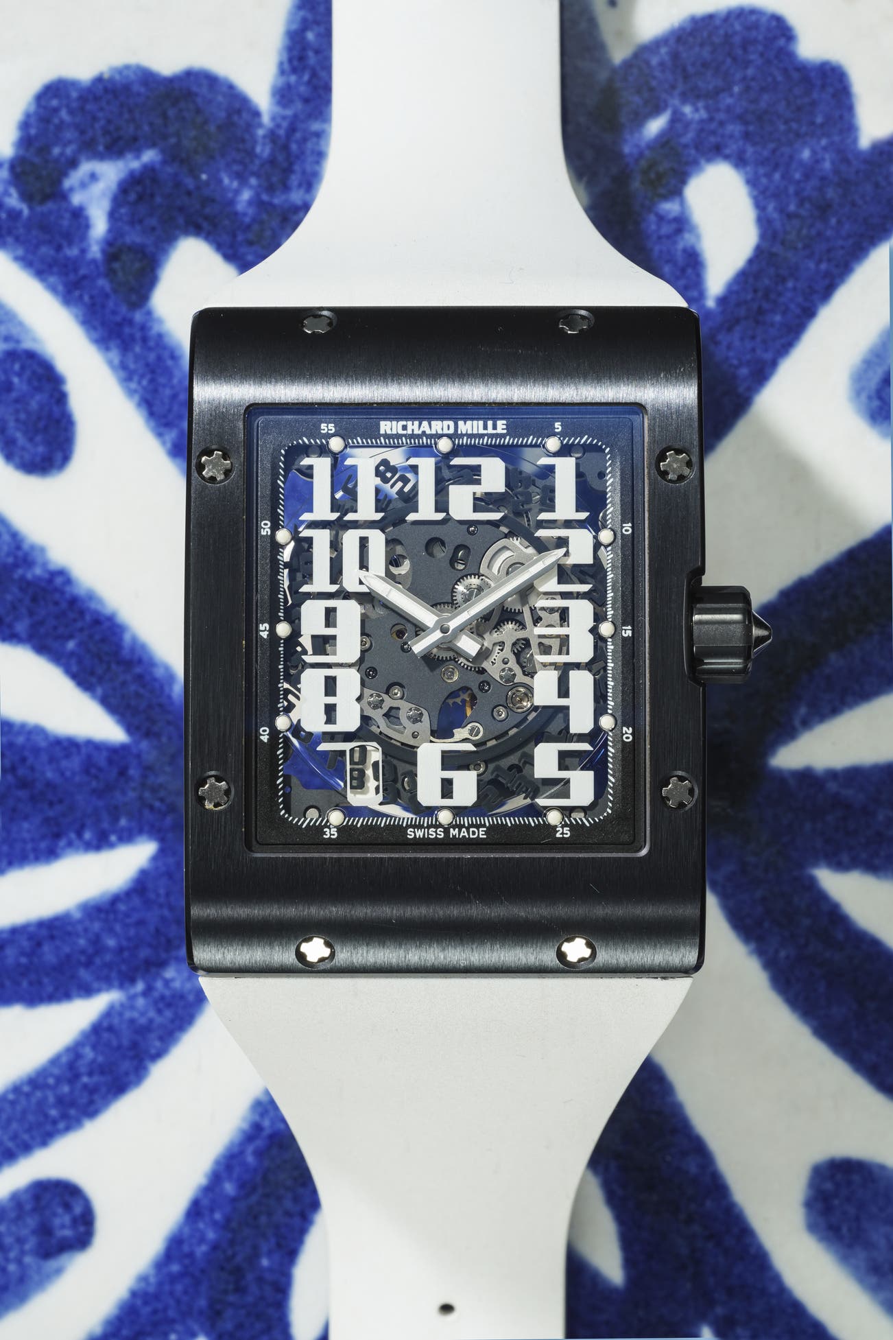 - Displaying a particularly thin rectangular case and skeletonized dial, the RM016 is a design departure from Richard Mille’s usual tonneau-shaped case. Presented in excellent and barely-worn condition, this timepiece is replete with the original warranty and winding box.