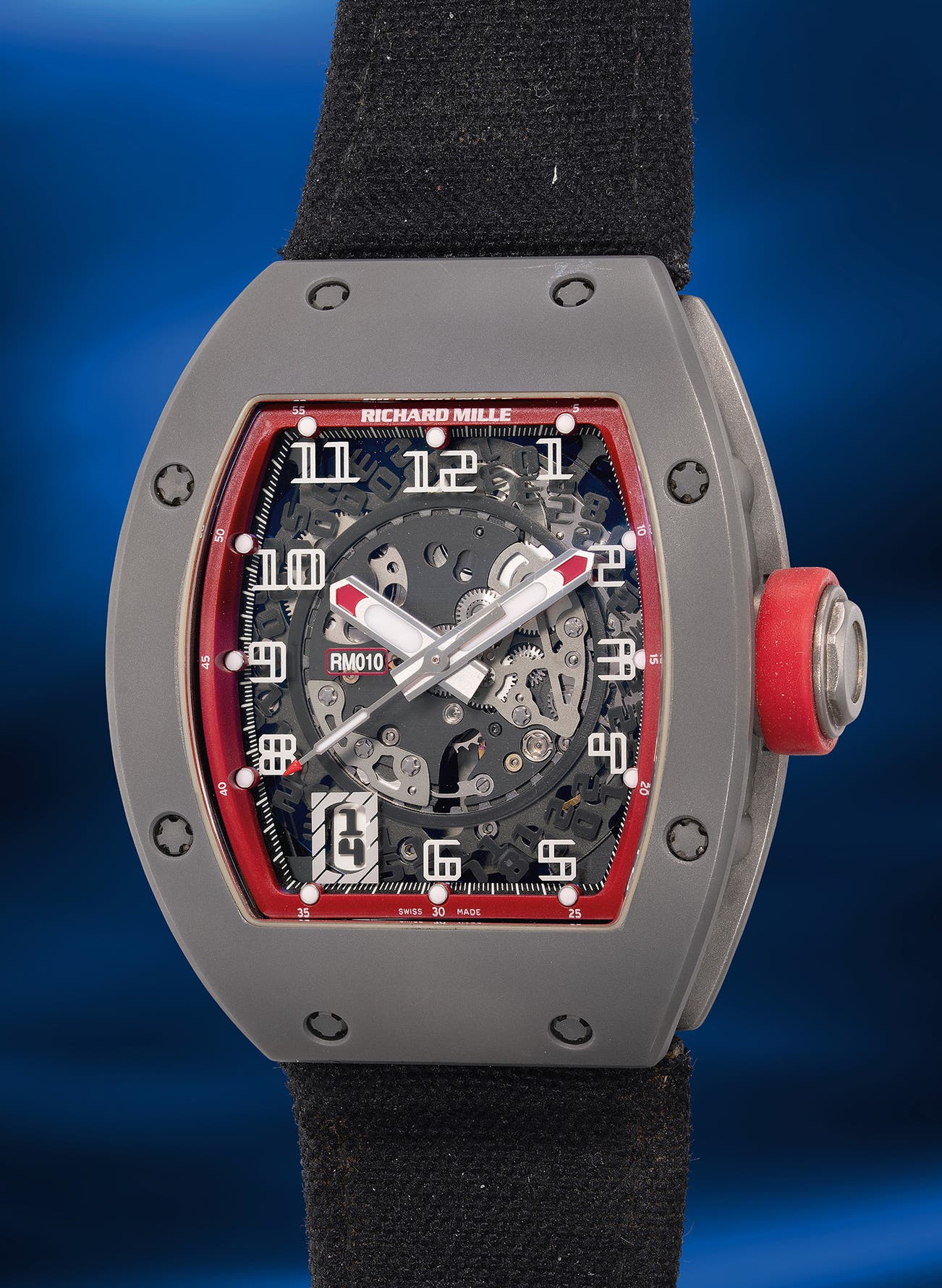 Produced in a variety of metals and editions, the RM010 remains one of the purest expressions of Richard Mille’s ethos and is destined to be remembered as one of the brand’s quintessential creations. The present limited edition example made for the Italian market, offered in excellent overall condition with two additional rubber straps, is crafted in grey titanium with punchy red accents, and is accompanied by its full set of accessories, including a winding presentation box—numbered 1 of 10 pieces only, this is a rare and compelling opportunity for collectors seeking to acquire a handsome Richard Mille timepiece.