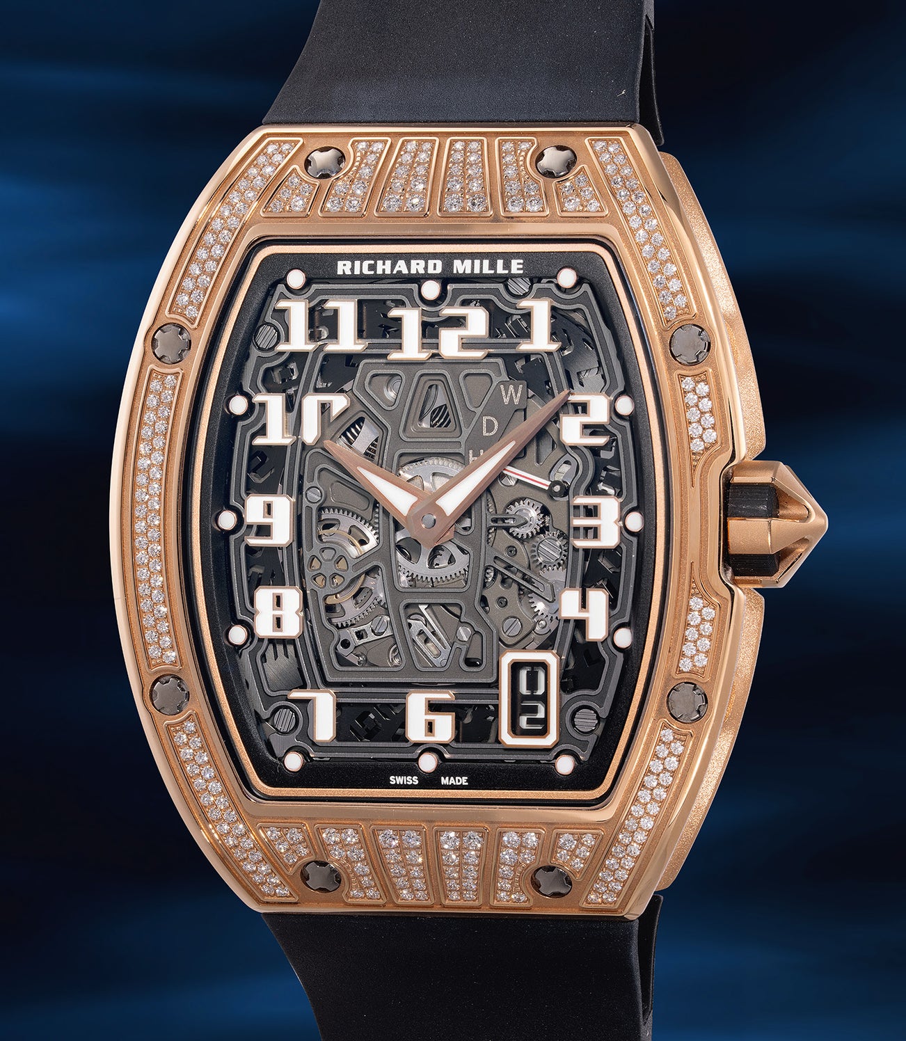 The present example is part of the more elegant configuration of the RM67-01, featuring a pink gold case set with 8 rows of diamond settings that run from the top to the bottom of the case, known to collectors as the "half diamond-set" version. This rare and desirable configuration is highly coveted by collectors today, as it combines the brand's technical prowess with a touch of luxurious refinement.