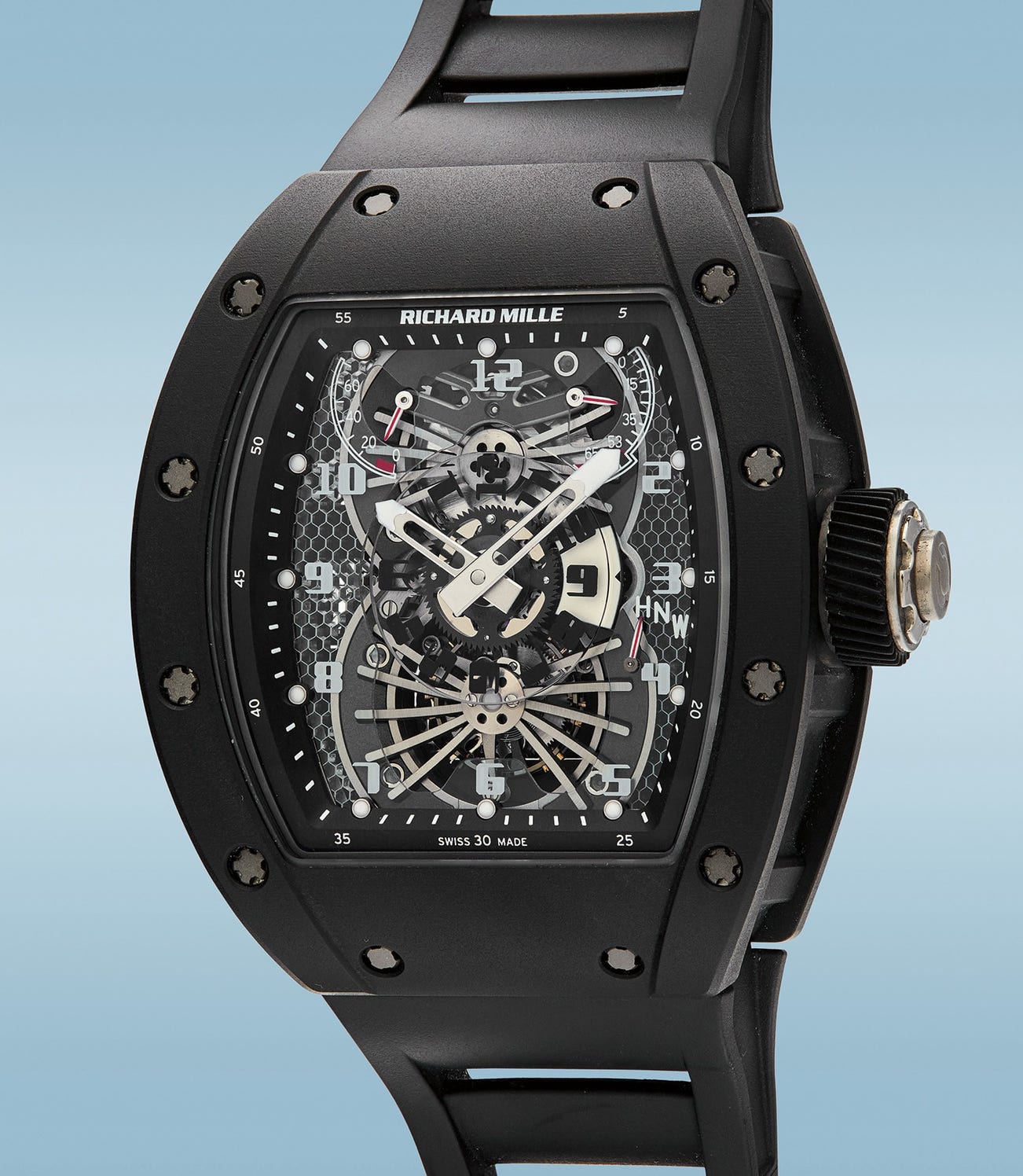 The RM022 manually-wound dual time tourbillon is a feat of engineering and technology with a case created from carbon nanotubes injected in to a black polymer. The result is an extremely durable material and 200 times stronger than steel, while at the same time being very light. This material allows the case to better absorb impacts, and demonstrated Mille’s commitment to innovative techniques in horology. The case of this limited edition model measures 50mm x 40mm x 16.15mm - slightly larger and with more presence than the standard RM022 model.