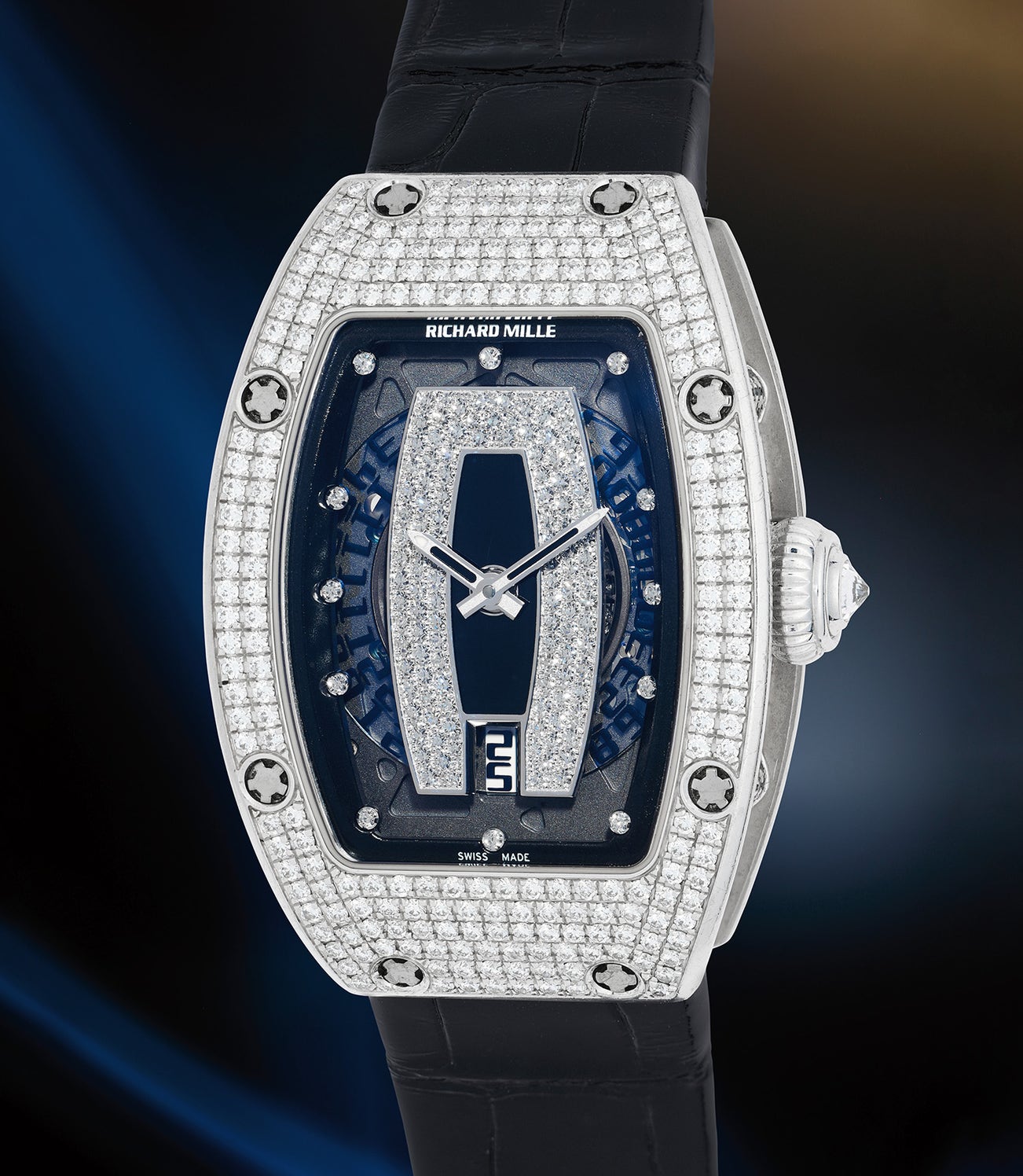 A particularly attractive example of an RM 007, it features a beautiful white gold case set with 650 diamonds, weighing over 4.845 carats. The beautifully diamond-set semi-skeletonized dial is also inlayed with a piece of black onyx stone, further extending this watch’s attractiveness. Inside ticks an innovative, self-winding movement with rotor in grade 5 titanium, and a tungsten carbide rotor system containing 18K gold micro-beads.