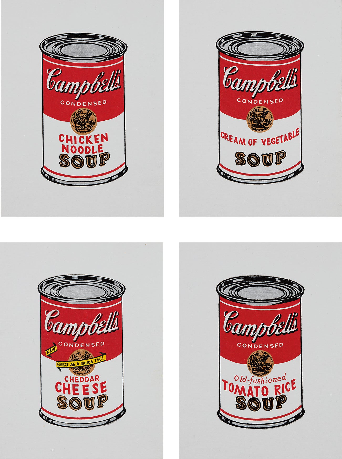 Chicken Noodle; Cream of Vegetable; Cheddar Cheese and Tomato Rice, from Andy Warhol, '32 Cans of Campbell's Soup,' 1962