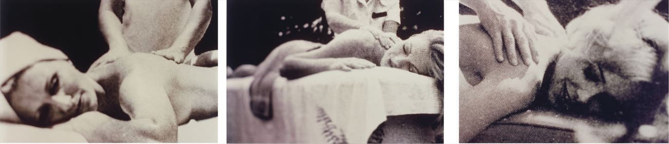 Richard Prince is both a hero and antihero of the photographic image. In 1980 Prince was working in the tear-sheet department of Time/Life and began to formulate a theses and a technique that would eventually make him one of the most recognizable artists of the late twentieth century. Untitled (Massage), 1980 features three separate scenes, each of a woman on the receiving end ofa massage, indicated by a truncated set of hands placed firmly on each woman’s body. The woman in each scene is depicted in a submissive state of pleasure, evidenced by their lack of eye contact with the camera and in their acquiescent posture.
