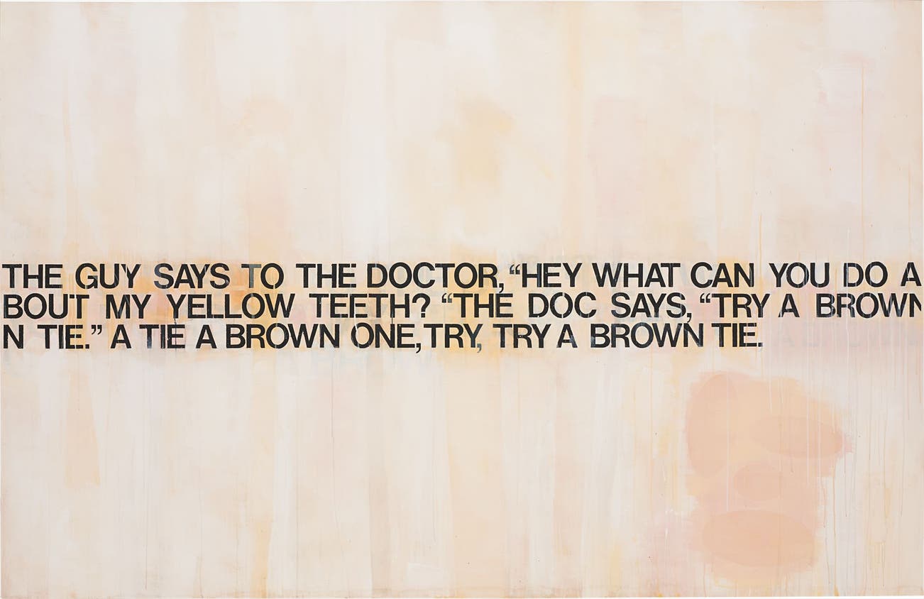 The joke itself is stenciled in black in a narrow band across the width of the canvas. Richard Prince’s first joke paintings date back to the mid-1980s when, after having posted up a small handwritten joke on a piece of paper, he started imagining how it would have looked on a gallery wall. At first handwritten, his jokes developed in time into more substantial works in which the same joke is repeated on monochrome canvases of different colors. Prince has devoted his career to this surface unreality, attempting to collect, count and order its ways. He has said that his goal is a ‘virtuoso real’, something beyond real that is patently fake. But his art is inherently corrosive; it eats through things. His specialty is a carefully constructed hybrid that is also some kind of joke, charged by conflicting notions of high, low and lower.