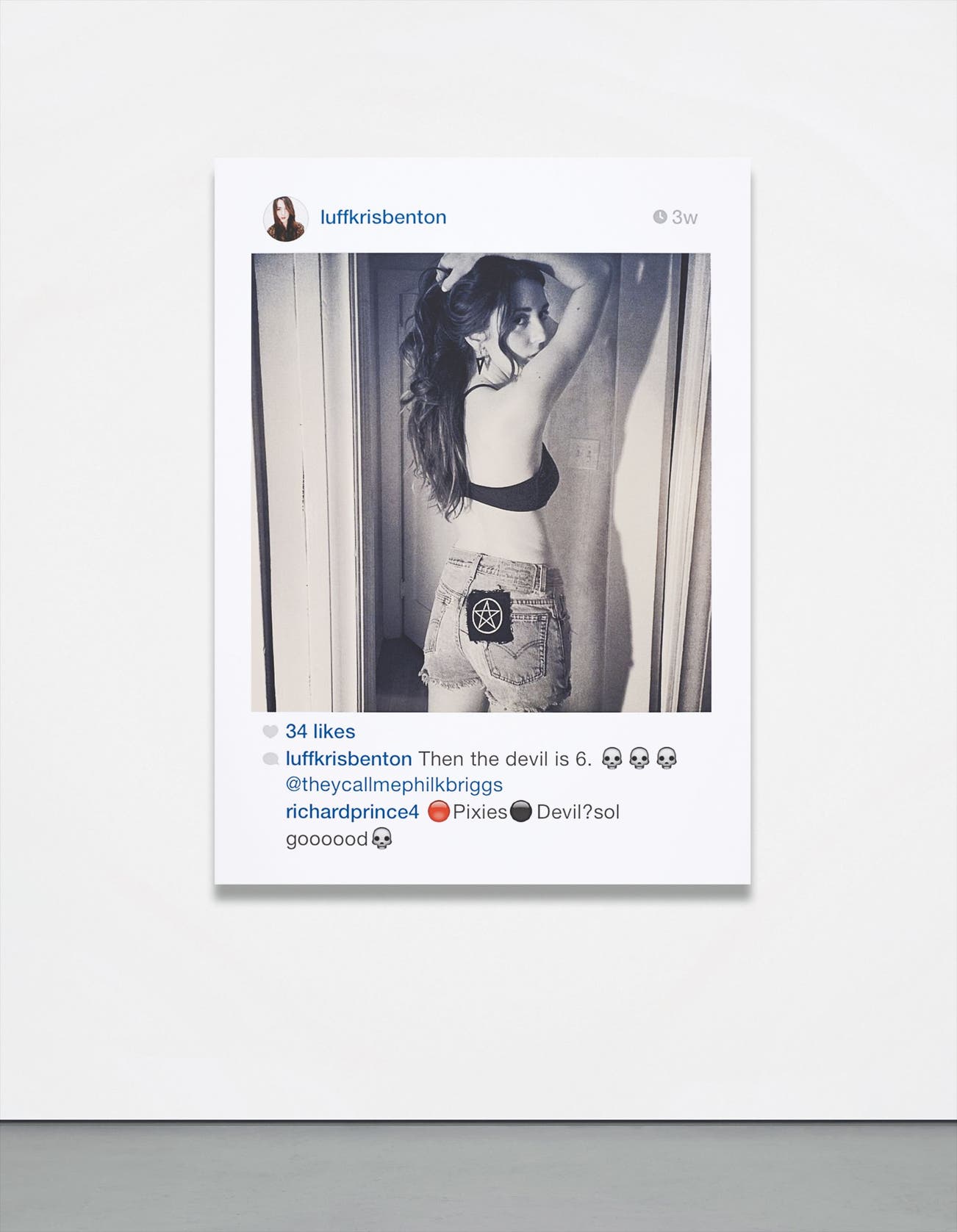 ‘They didn’t have to sit for their portrait. They didn’t have to make an appointment and come over and sit in front of some cyclone or in front of a neutral background or on an artist’s stool. They didn’t have to show up at all. And they wouldn’t be disappointed with the result. How could they? It wasn’t like they were giving me photos of themselves that were embarrassing.’ (R. Prince quoted in “Richard Prince: New Portraits”, Press Release: Gagosian Gallery, 9 June 2015).