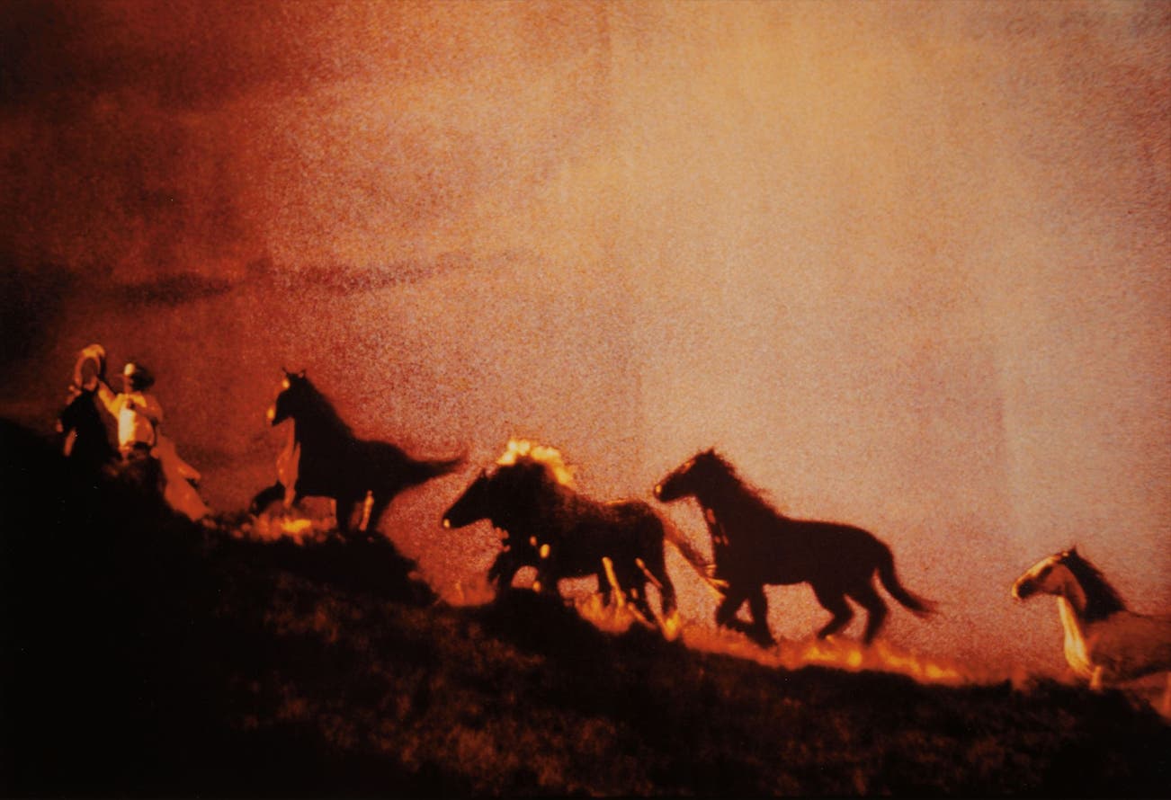 Remarkably bold in composition and appropriative artistic gesture, Untitled (Cowboy) rides across the silhouetted plain, lasso in one hand, reigns in the other, a herd of wild mustangs galloping behind, as though somehow tamed by his profuse machismo. The glowing, cinematic sky and fading light signal that the day is almost finished, and soon will be rewarded with a cigarette, the pleasurable climax of a hard day’s work. This type of allusionary imagery, which refers to, but does not expressly show cigarettes or smoking, trades on the cowboy’s cultural currency and the viewer’s ability to access dislocated objects of desire. Such complex marketing images are born of necessity, the result of increased government regulation of tobacco advertising beginning in the 1980s when a more health conscious public began referring to Marlboro cigarettes as “cowboy killers.”