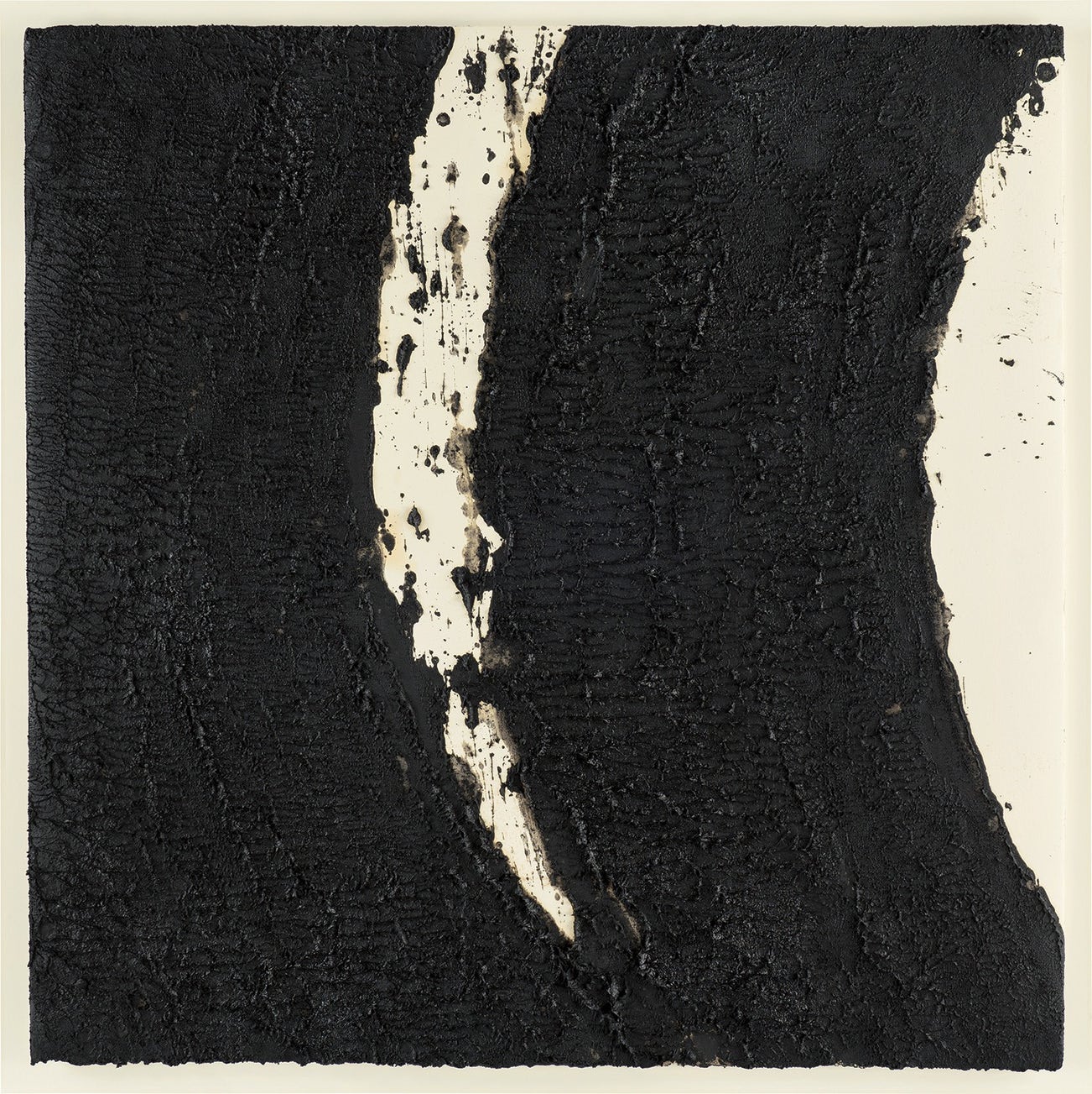 Serra has worked with paintstick since the early 1970s, when he began to create his monumental series of Installation Drawings in an investigation of process and site-specificity. Since this period, his drawings have evolved through several different phases before developing into the Solids series, to which Track 31 belongs. Track 31’s dense, grainy surface is the result of a long and extremely physical process of working the surface, in which Serra first spreads a sheet of handmade paper on top of a heated block of paintstick before pressing it into the paper using a steel block and the weight of his own body. As Neil Cox describes, chance is paramount to each drawing: “The process depends on achieving even pressure across the surface, sensing the marking, through the movement of the hand, through embodied memory and visual tracking over the blank white sheet… Once the process is felt to have reached its end—then and only then is the paper lifted from its bed of black matter” (Neil Cox, “The Shape of Feeling, in Richard Serra: Drawings 2015-2017, exh. cat., Museum Boijmans Van Beuningen, Rotterdam, 2017, pp. 12-13). Allowing his method of work to define intention, Serra’s drawings mirror the formation of volume that becomes physically realized in his acclaimed sculptures. Bristling with textural palpability, Track 31 mediates the spectator’s perception of its surroundings by redefining and articulating space and time.