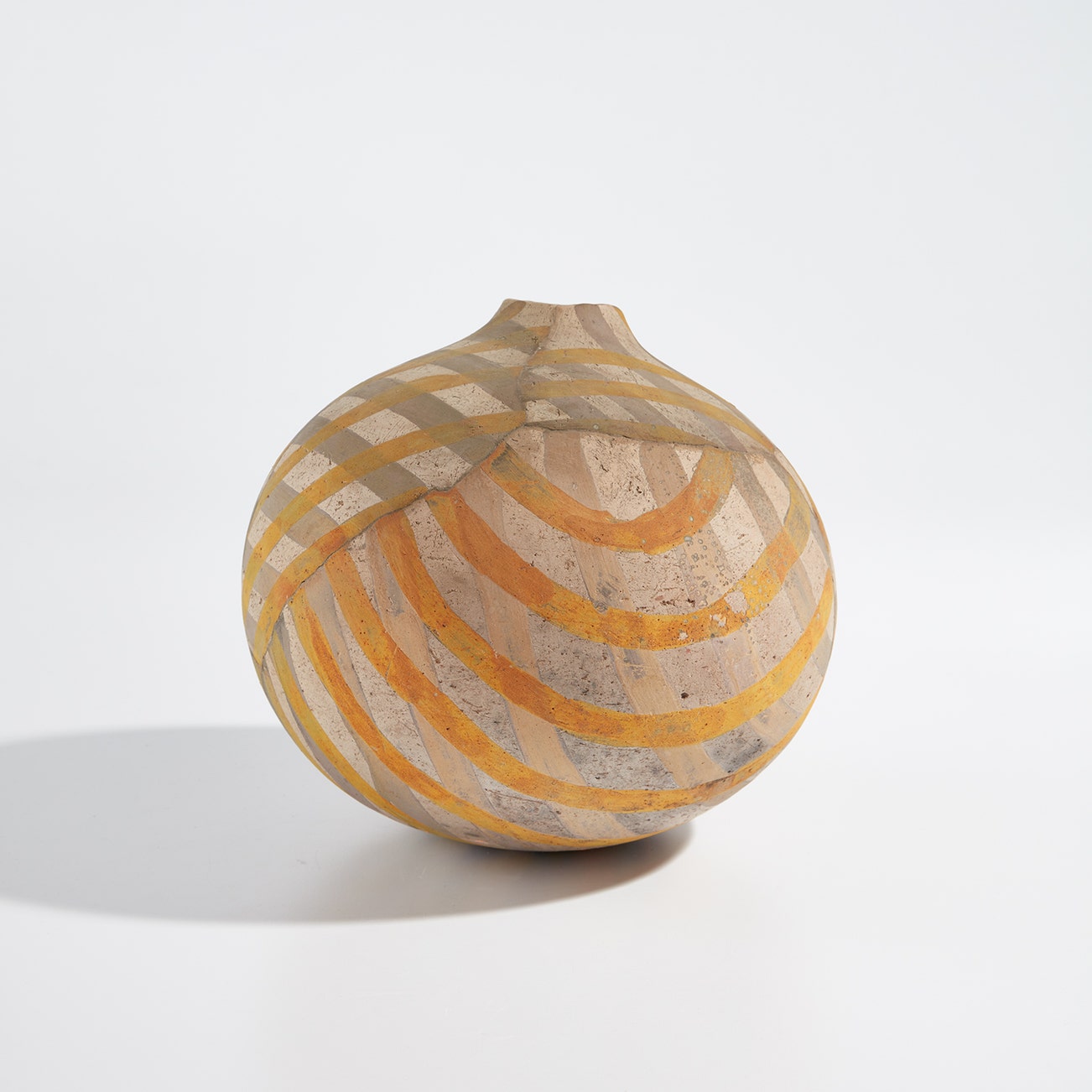 Broken and reassembled Raku-fired glazed earthenware.