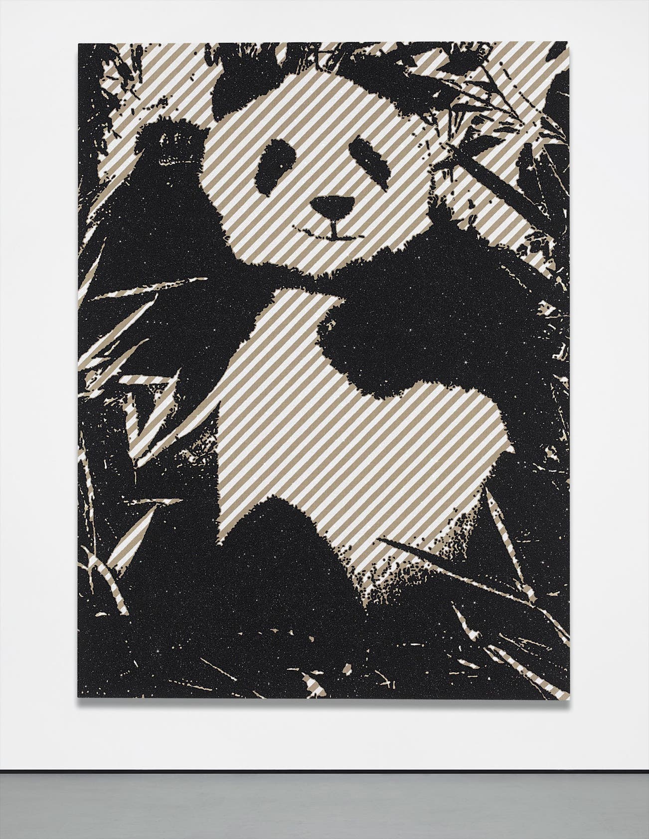 Rob Pruitt’s glittering image of a contented giant panda, Sottsass Bear, forms part of the artist’s larger series of paintings depicting the dying species. A master at crafting works that are universally likeable as well as probing, Pruitt has the rare ability to transform low brow kitsch into high brow art. The present lot is an outstanding example of the artist’s Warholian appropriation of subject, style and technique to paint an honest, yet tragic image of the current state of humanity. Pruitt uses the image of the panda—an animal that is blissfully unaware of its impending demise, even resentful of the scientists trying to help it survive—to satirise our own contented lifestyles.