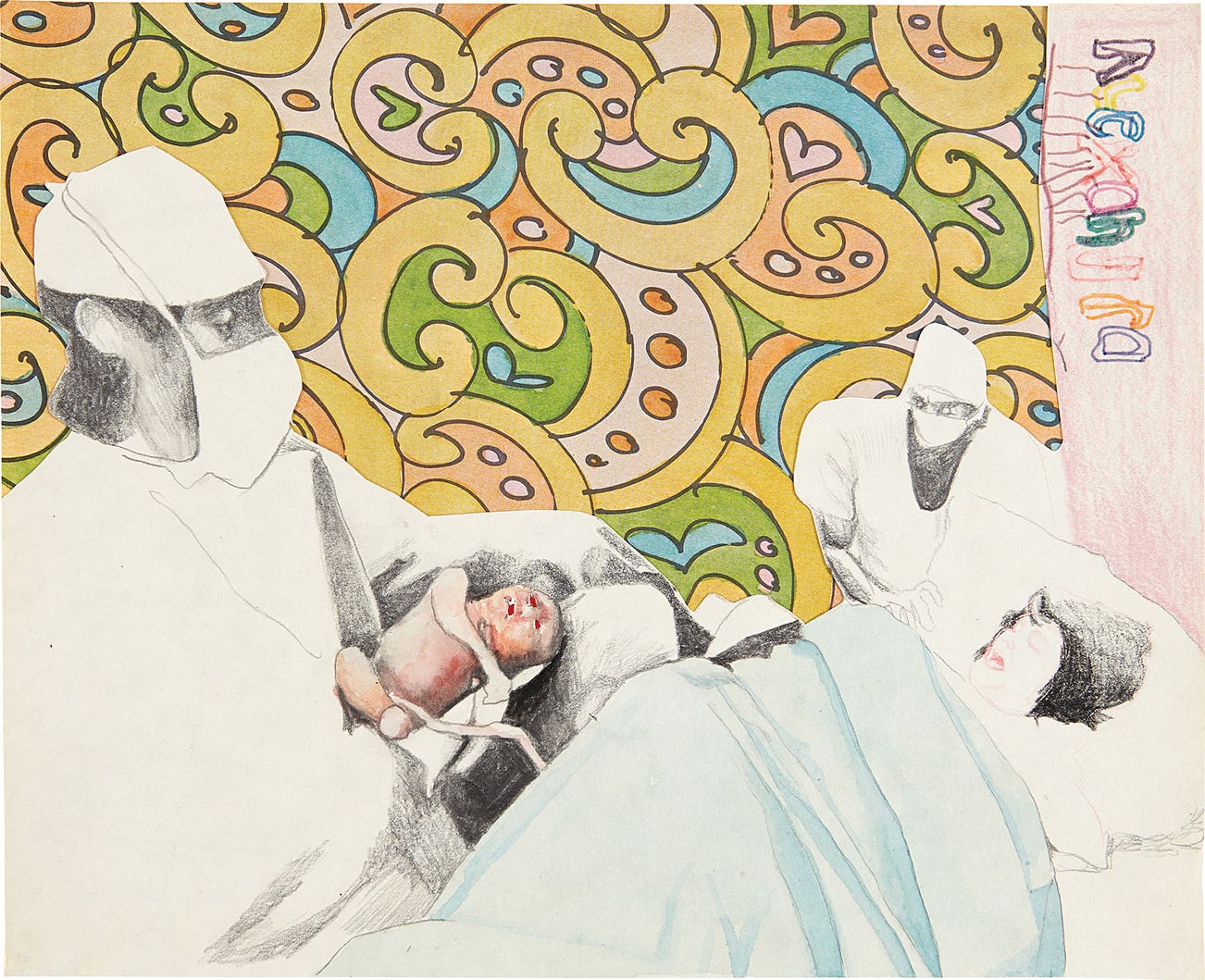 collage, graphite, charcoal, and watercolor on found paper
