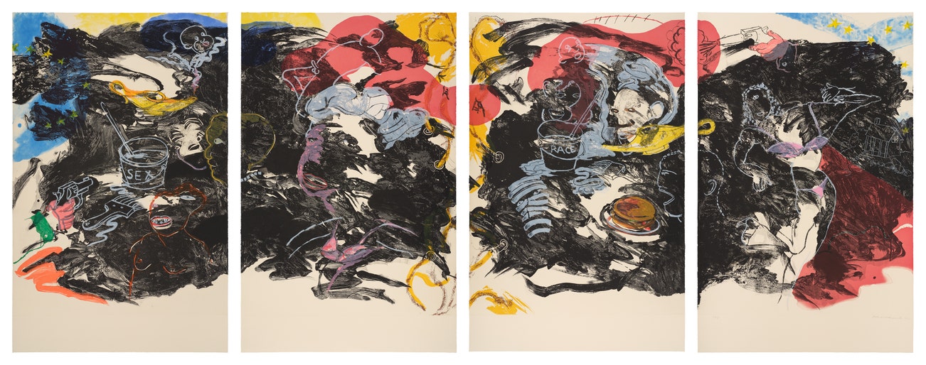 Monumental etching and aquatint quadriptych in colors, on Arches Cover paper, the full sheets.