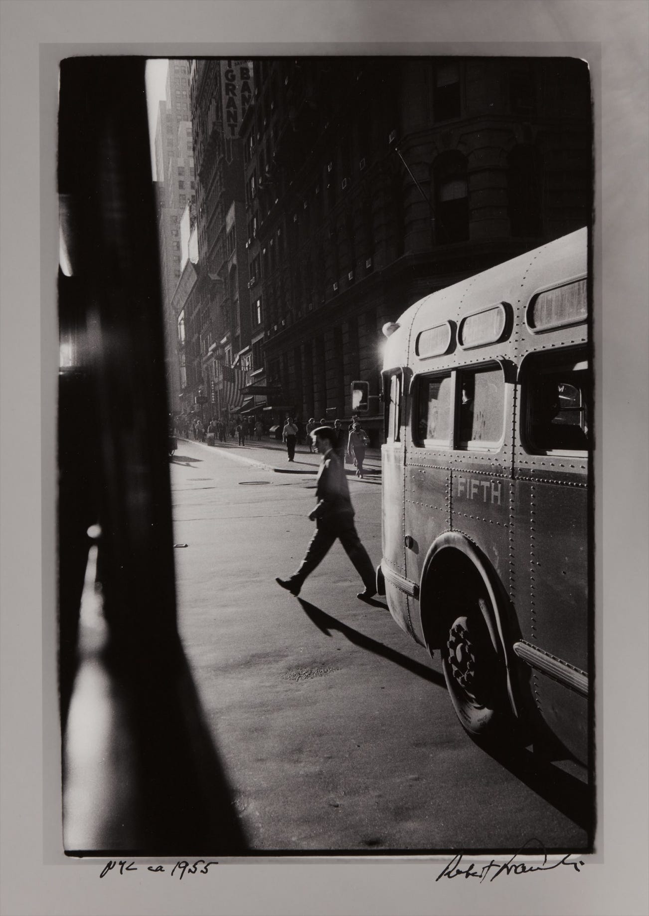 In 1958 Robert Frank began a series of photographs he took while riding the bus through New York City. He printed many of these images with a distinctive gray margin, including the print offered here, “to heighten the feeling of seeing from the inside to the outside.”