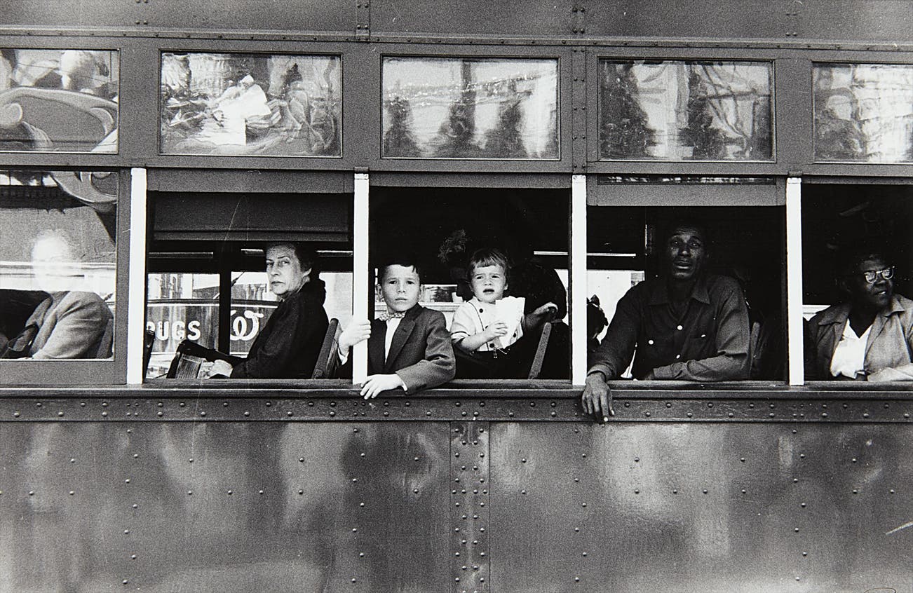 As the first European to be awarded the Guggenheim Fellowship in 1955, Robert Frank embarked on a cross-country journey that, over nine months, took him through 30 states with over 700 rolls of film. In the fall of 1955 he arrived in the American South, on the cusp of the Civil Rights movement and was astonished by the discrimination he witnessed. Frank described the impression it left: “My attitude changed when I saw the South for the first time. That was the strongest and most unforgettable impression. The injustice to people who have another skin color.” Whereas his mentor Walker Evans documented the South by focusing on objects and the past; Frank honed in on ‘the now’, the people and the adversity they faced every day. This adversity was something that Frank could relate to; just days before reaching Louisiana where this iconic image Trolley, New Orleans was taken, he was arrested for suspicious activity. He found the experience humiliating, but it amplified his compassion and sharpened his perspective while he photographed "[I] became like a cop watching people, observing them, stealing." His photography style became casual, but acute, with constant movement, quoting his friend Allen Ginsberg "First thought, best thought. .... When one releases a second time, there is already a moment lost." While observing a parade in New Orleans, he turned away from the procession and stumbled upon the scene he would capture: the stark profiles of six passengers framed by the windows of a crowded trolley. From left to right they are perfectly ordered echoing the American social hierarchy of the era. Each figure either staring ahead or to the side with expressions void and isolated. The image provides a piercing social commentary on American race relations in the mid twentieth century but it does so with the visual language of an artist. Frank had a fascination with windows as seen throughout the images in The Americans. In cars, buildings, buses, or trolleys, windows mimicked the camera’s lens and created natural frames within the photos. Trolley, New Orleans is dominated by framing windows which divide the passengers while the upper register contains abstract and ambiguous reflections of the surrounding buildings; a theme reminiscent of the abstract paintings of contemporaries Alfred Leslie, Franz Kline, and Williem de Kooning. Frank’s mastery of the medium is thus evident in his ability to seamlessly address the complexity of contemporary social issues with great aesthetic interest.