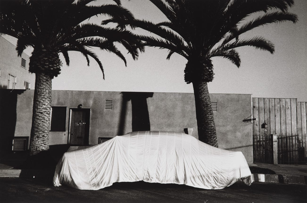 Car culture was a novelty to Frank whose Swiss upbringing did not prepare him for the love and attention Americans lavished upon the automobile. Many Californians had arrived in the state in the broken-down cars so memorably depicted in the photographs of Dorothea Lange. Two decades later, in 1950s California, Frank discovered that the automobile had undergone a remarkable transformation from a frequently unreliable jalopy into a fetishized object. Jack Kerouac, in his freewheeling introduction to The Americans, comments on the irony so aptly captured by Frank in this photograph: 'Car shrouded in fancy expensive designed tarpolian to keep soots of no-soot Malibu from falling on new simonize job as owner who is two-dollar-an-hour carpenter snoozes in house with wife, and TV, all under palm trees for nothing, in the cemeterial California night.'