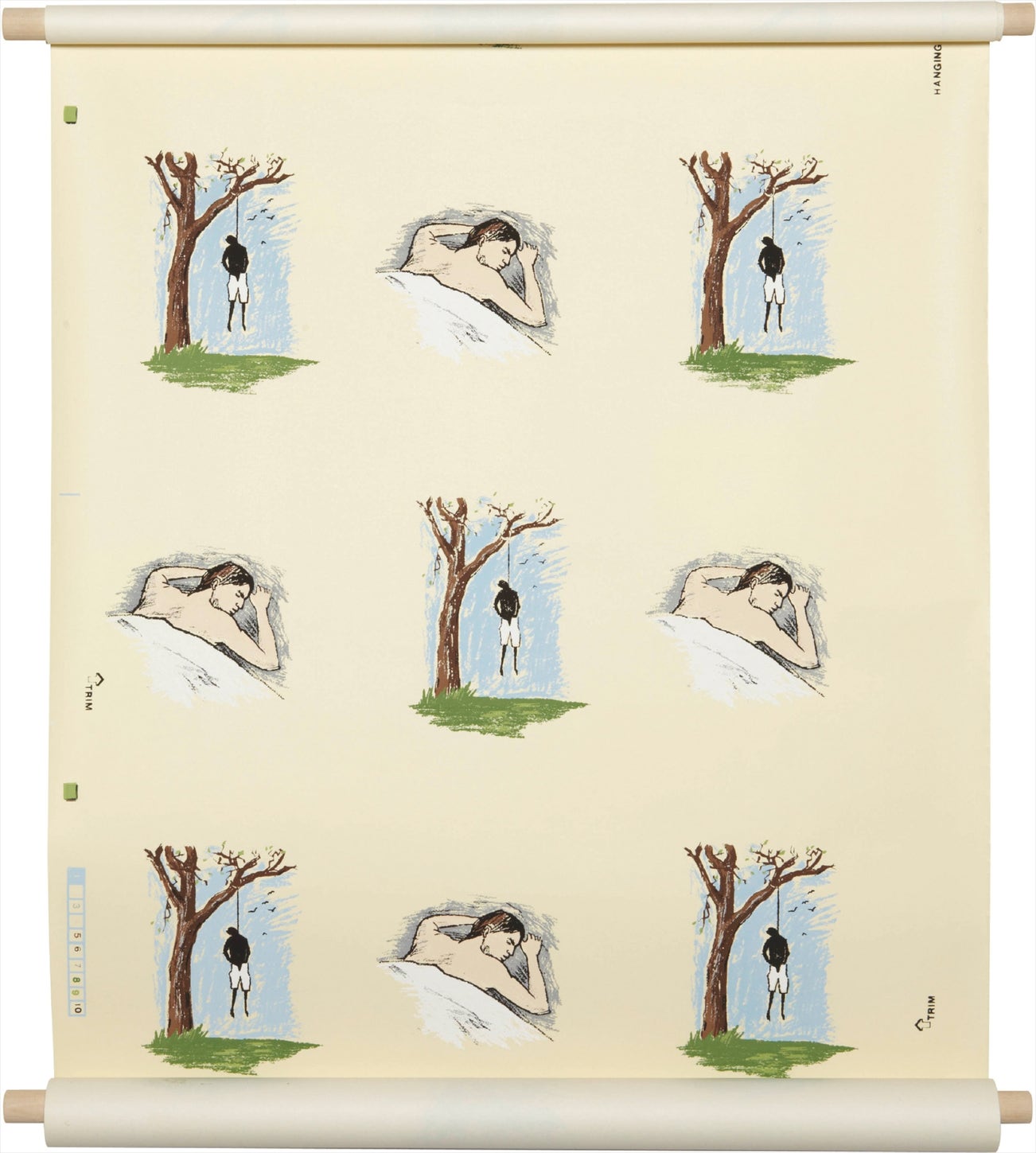 Screenprint in colors, on wallpaper (presumably a full roll), the full sheet, framed as a scroll.