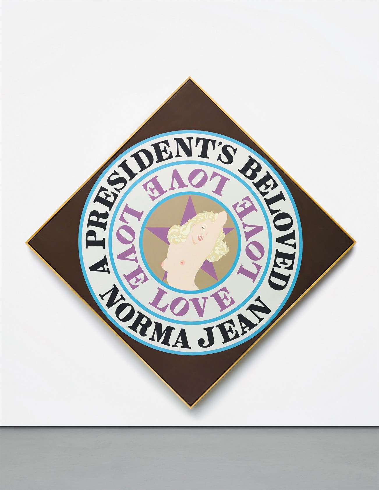 The present lot is a remarkable example of Indiana’s later works. Rare in its large scale, the work was included in the Eros in Modern Art exhibition at the Beyeler Foundation in 2006 alongside other icons of modern “eros” from artists as diverse as Jeff Koons, Pierre Bonnard, and Louise Bourgeois. Having left New York in 1978 and settling full time on a small island in Maine, Indiana developed a distinct and personal iconography that has become instantly recognizable. The motifs in the present lot are pulled from some of Indiana’s past works: the central figure, Marilyn Monroe was first utilized by Indiana in the late 1960s in a work titled The Metamorphosis of Norma Jean Mortenson (1967). The source image, titled Golden Dreams is the month of January from a nude pin-up calendar of the actress from 1955. Alongside this seductive pose, Marilyn is placed against a purple star to further emphasize her unparalleled silver screen status. Marilyn is the epitome of the American Dream, representing youth, glamour, and celebrity; however, she also exemplifies the dark desperation, loneliness and desolation that haunts many of those who reach the top. In this work, Marilyn stands at the center of the painting encircled by two bands of words, the closest to her reading “Love Love Love Love” while enclosed in the outermost band are the words that make up the works title “A Presidents Beloved Norma Jean.” The title of this work refers to the scandalous relationship between Marilyn and President John F. Kennedy, however, by addressing her by her birth name, Indiana also draws attention to the transformation the innocuous Norma Jean underwent in order to become the famed Marilyn Monroe.