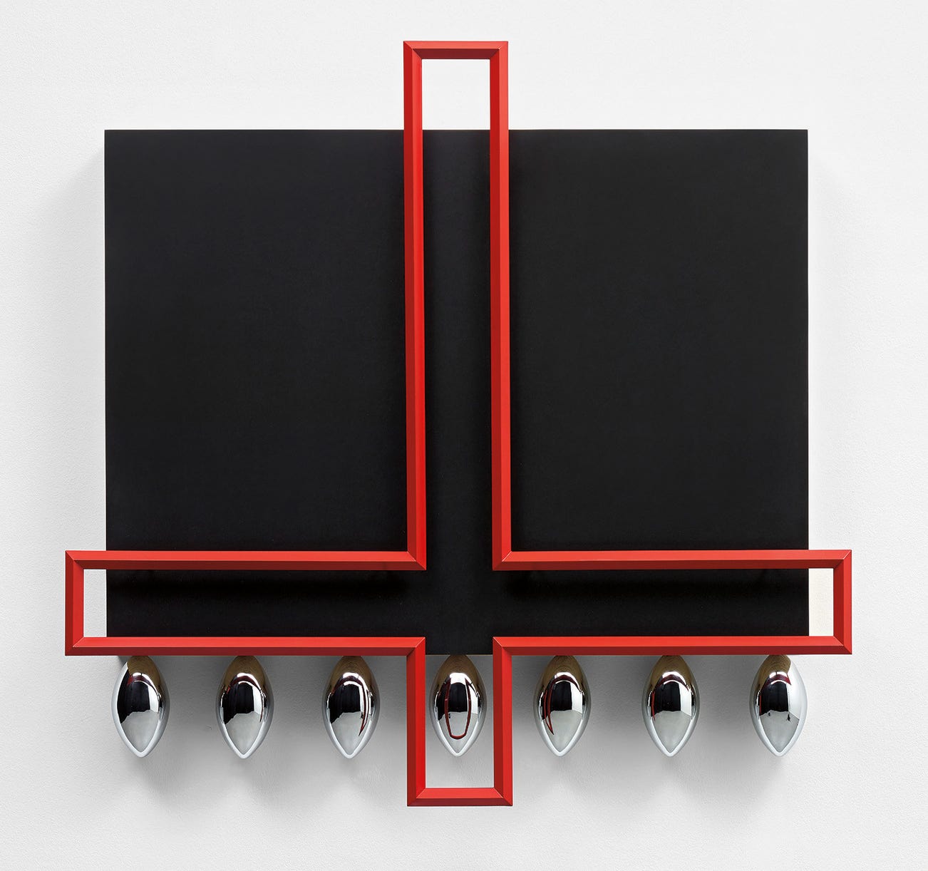 Linoleum covered plywood multiple with red lacquered aluminium and seven chrome-plated oval copper forms.