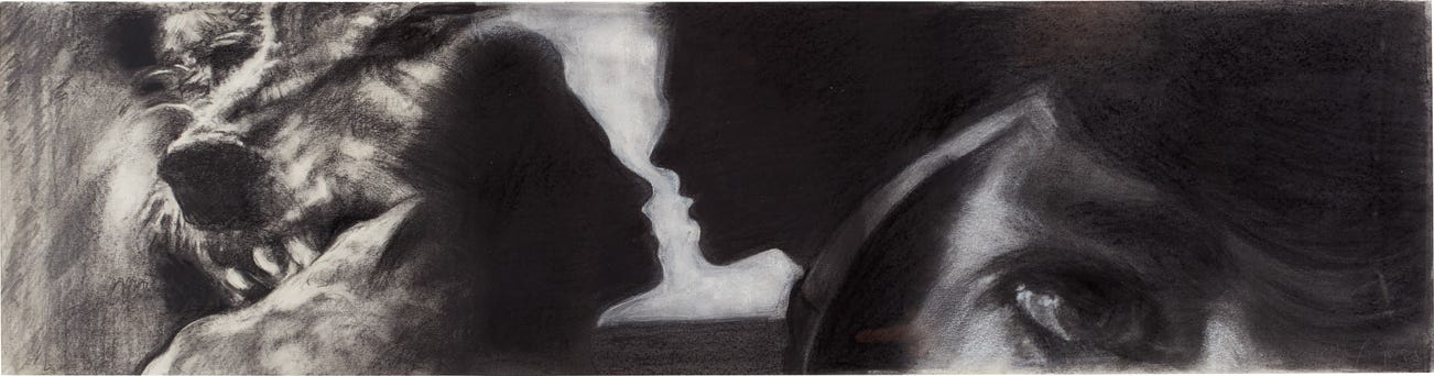 signed and dated "Robert Longo 85" lower right; partially titled "Lover's eye" lower left