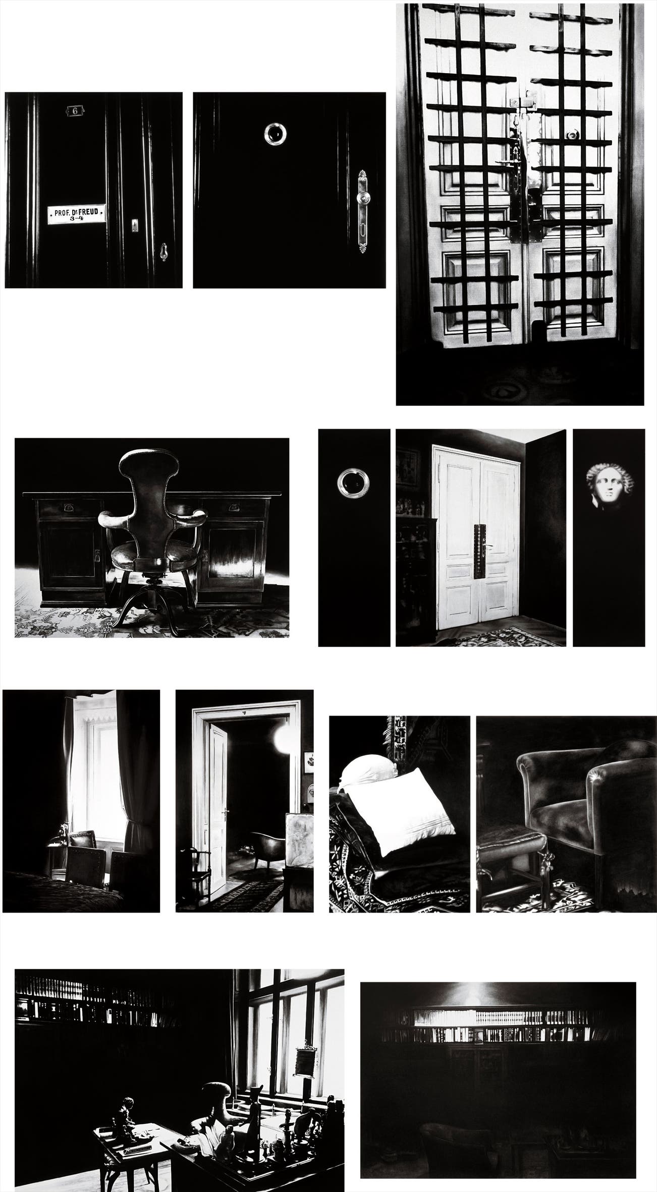 Including: Exterior Apartment Door with Nameplate and Peephole (diptych); Interior Apartment Front Door with Bars; Freud's Desk and Chair, Study Room; Peephole, Consulting Room Door, Head from Shelf (triptych); Drapes with Telephone; Open Door, Consulting Room to Study Room; Pillow and Chair, Consulting Room (diptych); View of Study Room, with Books, Desk and Window; and Bookcase in Study Room