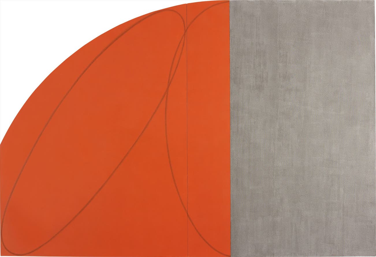 Yet we also find both Barnett Newman and Mark Rothko at work in the present lot as well. While Rothko’s vertical arrangements of color field painting figure in to Mangold’s organization of red and gray, Newman’s Be I (Second Version), 1970 cues us in to the similarity in vertical axes between the two pieces—while Newman’s employs a single canvas and explores the division between the two halves, Mangold’s is a painting that explores contrast as much as comparison. We find this exploration of contrast a constant in his work, as Curved Plane/Figure VII (Study), 1995 is a precursor to the present lot and belongs in the permanent collection of the Cleveland Museum of Art. The present lot almost seems like an introduction to the body of work from this decade as the orange and soft grays both resist and interact with one another, married by the soft graphite lines that curve across their surfaces.