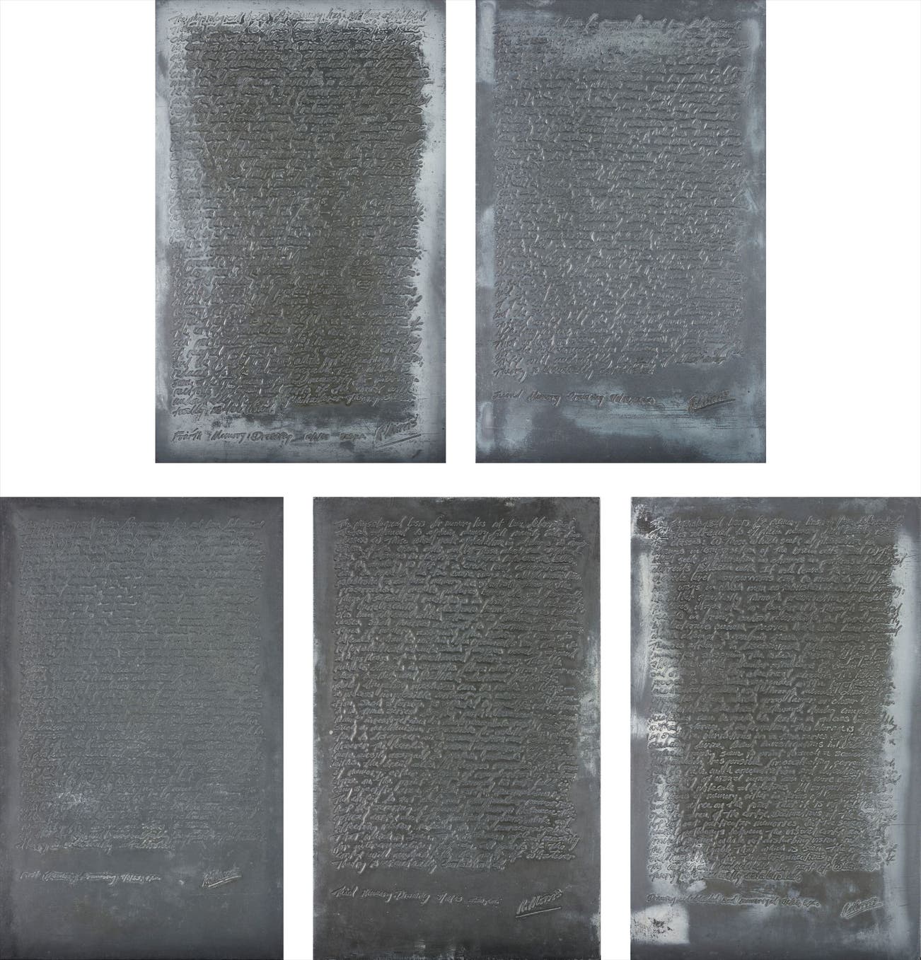 The complete set of five lead sheets with embossing, stretched over chipboard panels (as issued),